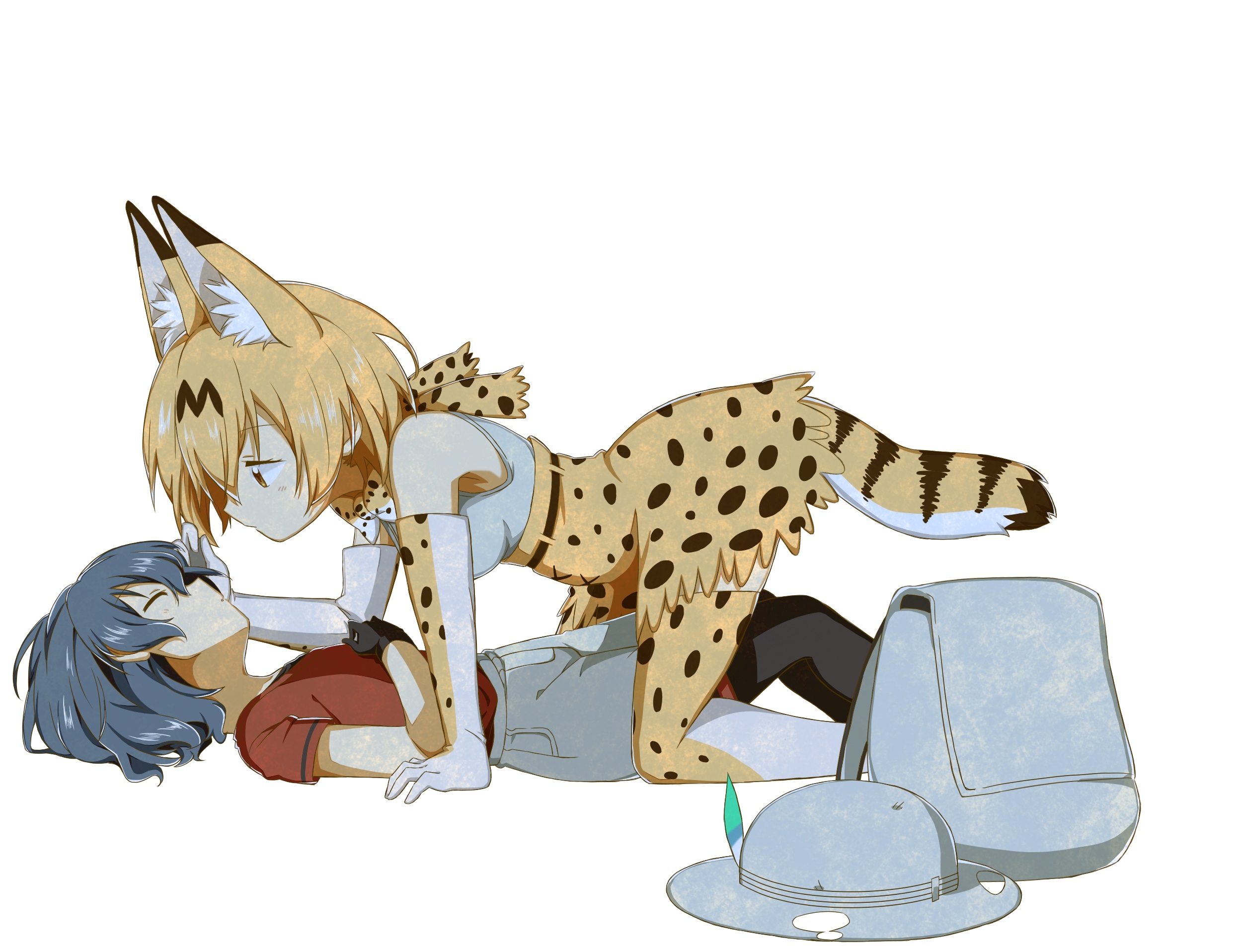2girls animal_ears bag black_hair blonde_hair cat_ears cat_girl cat_tail closed_eyes closed_mouth elbow_gloves gloves hat highres kaban_(kemono_friends) kemono_friends multiple_girls pantyhose serval_(kemono_friends) shigure_(sigre) shirt short_hair tail thighhighs unworn_hat unworn_headwear white_background white_shirt yellow_gloves