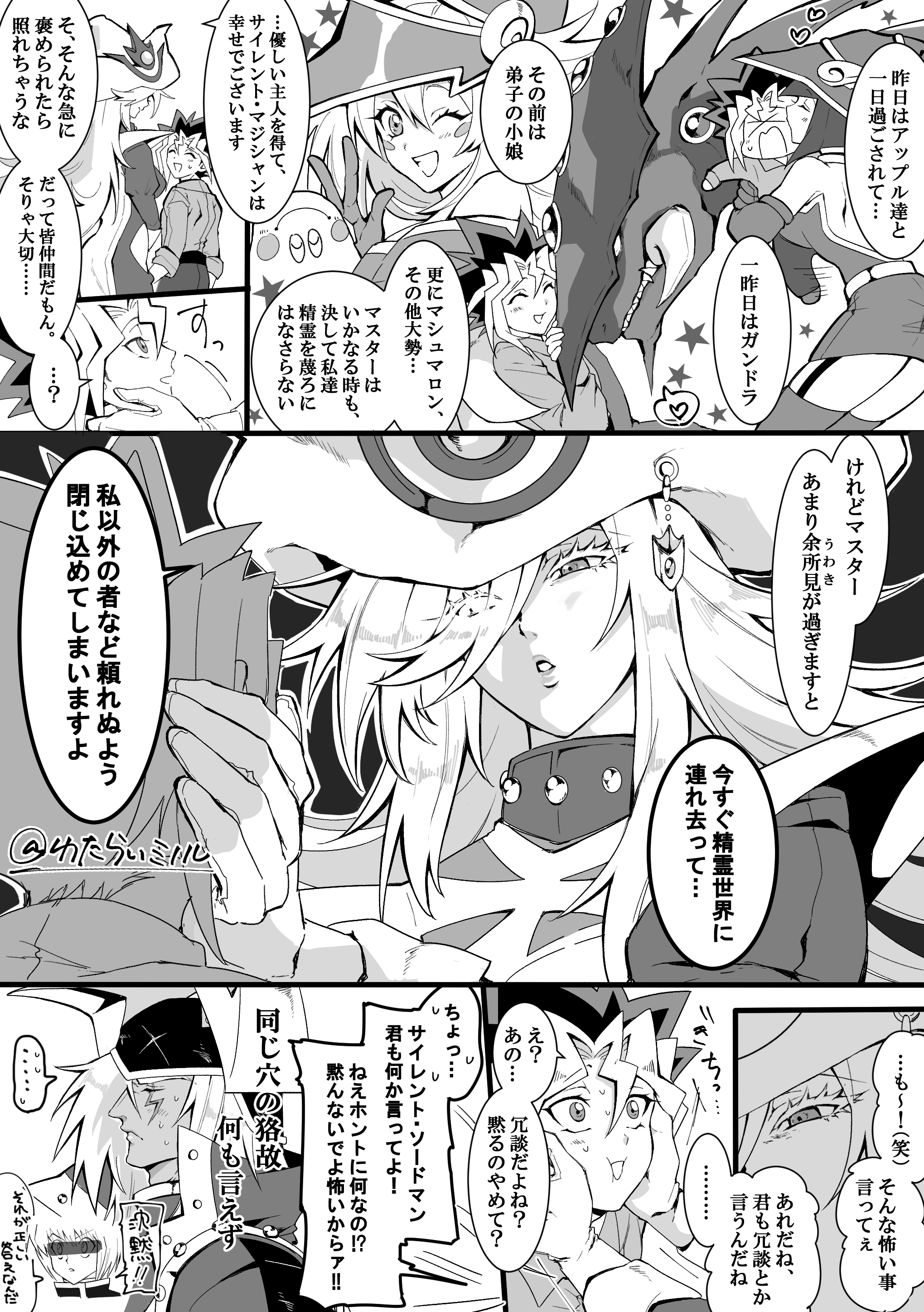 absurdres apple_magician_girl artist_name blush choker commentary_request dark_magician_girl duel_monster gandora_the_dragon_of_destruction gloves greyscale hair_over_one_eye hat helmet highres horns long_hair mi_manu1950 monochrome multicolored_hair multiple_boys multiple_girls muto_yugi open_mouth silent_magician silent_swordsman smile speech_bubble tabard translation_request white_gloves white_hat white_tabard wizard_hat yu-gi-oh!