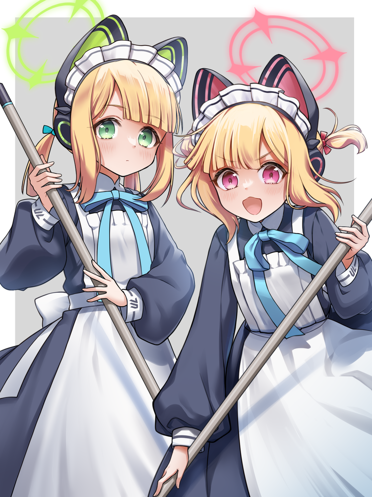 2girls animal_ear_headphones animal_ears apron back_bow black_dress blonde_hair blue_archive blue_ribbon blunt_bangs blush border bow cat_ear_headphones cat_ears closed_mouth collared_dress commentary_request contrast_collar dress fake_animal_ears frilled_apron frills green_bow green_eyes green_halo grey_background hair_bow halo headphones holding holding_mop long_sleeves looking_at_viewer maid maid_apron maid_headdress midori_(blue_archive) midori_(maid)_(blue_archive) momoi_(blue_archive) momoi_(maid)_(blue_archive) mop multiple_girls neck_ribbon official_alternate_costume official_alternate_hairstyle open_mouth outside_border parted_bangs partial_commentary pink_eyes pink_halo puffy_long_sleeves puffy_sleeves red_bow ribbon short_hair short_twintails siblings sidelocks simple_background sisters smile suzumori_shuka twins twintails v-shaped_eyebrows white_apron white_border white_bow white_headdress