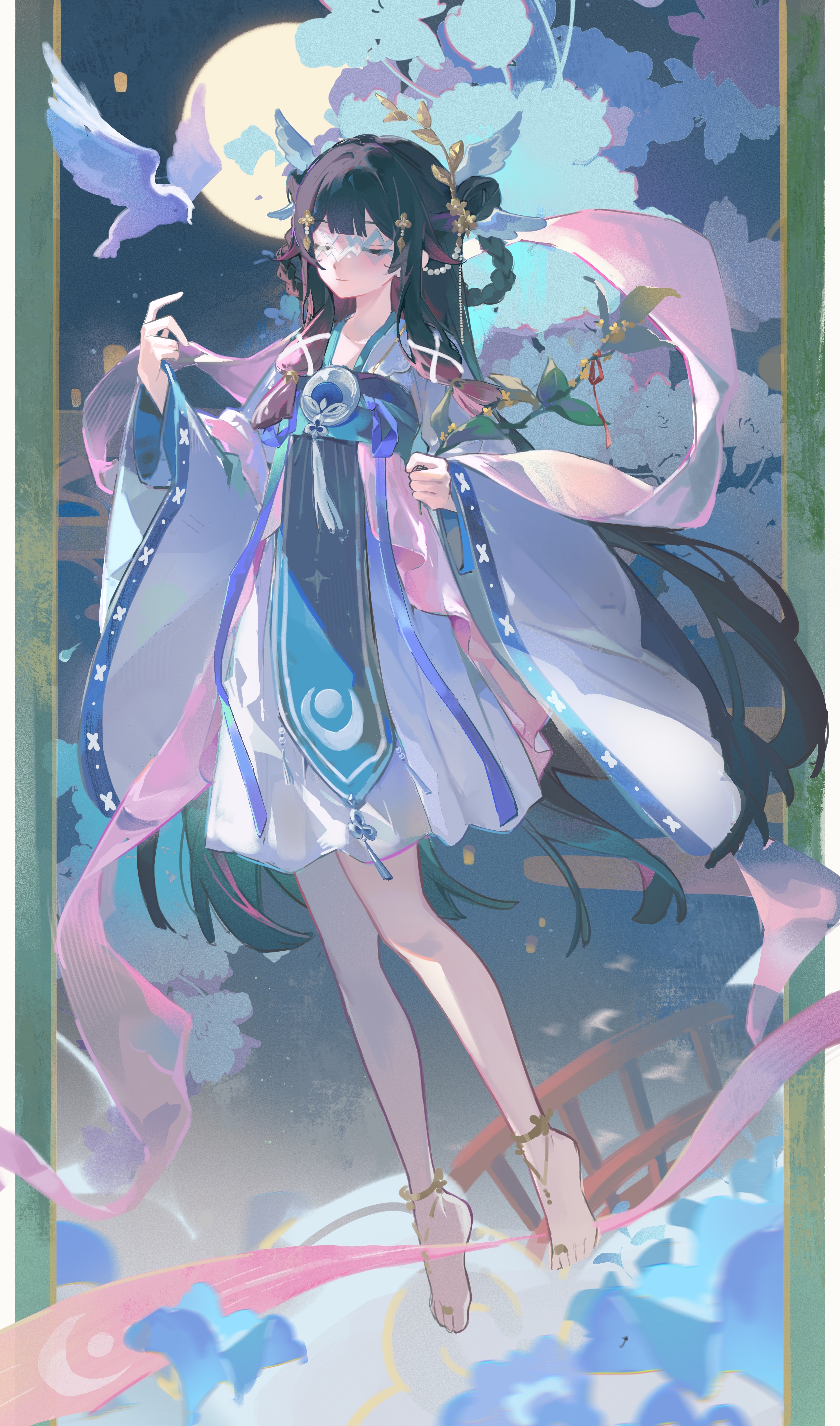 1girl absurdres alternate_costume alternate_hairstyle bird black_hair braid chinese_commentary closed_eyes closed_mouth columbina_(genshin_impact) commentary_request double_bun eye_mask full_moon genshin_impact hagoromo hair_bun hair_ornament hair_rings head_wings highres holding holding_plant long_hair mask moon multicolored_hair no_pants pink_hair plant sash shawl solo streaked_hair twin_braids two-tone_hair very_long_hair white_bird white_wings wide_sleeves wings yuki_(miyuki_kii)