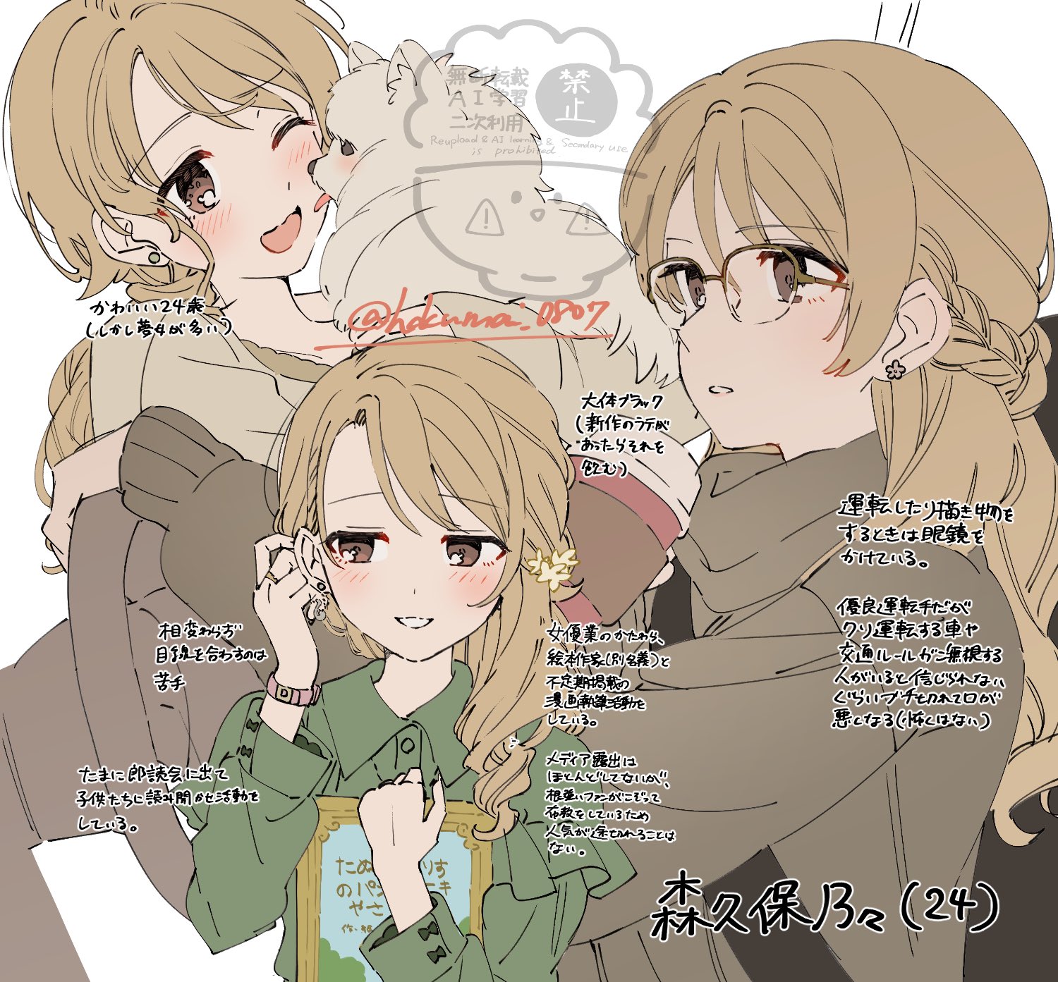 1girl ;d aged_up averting_eyes bespectacled book braid brown_hair character_age character_name dog driving earrings glasses green_shirt half_up_braid highres holding holding_book idolmaster idolmaster_cinderella_girls jewelry long_hair looking_ahead looking_at_animal morikubo_nono multiple_views one_eye_closed open_mouth over-rim_eyewear raru_buran ring seatbelt semi-rimless_eyewear shirt simple_background smile steering_wheel stud_earrings tucking_hair watermark white_background white_dog