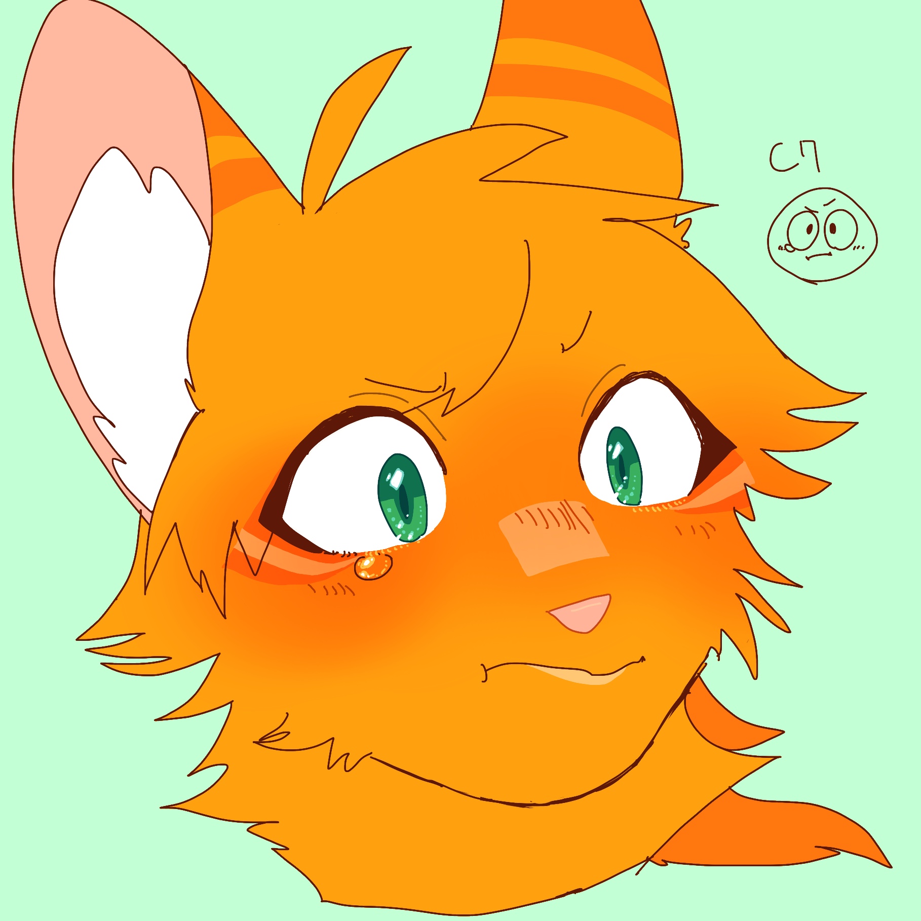 ahoge animal animal_focus blush cat commentary_request cropped_head embarrassed firestar_(warrior_cats) flustered green_background green_eyes highres looking_at_viewer neko_gokoro no_humans orange_cat simple_background solo tears warrior_cats