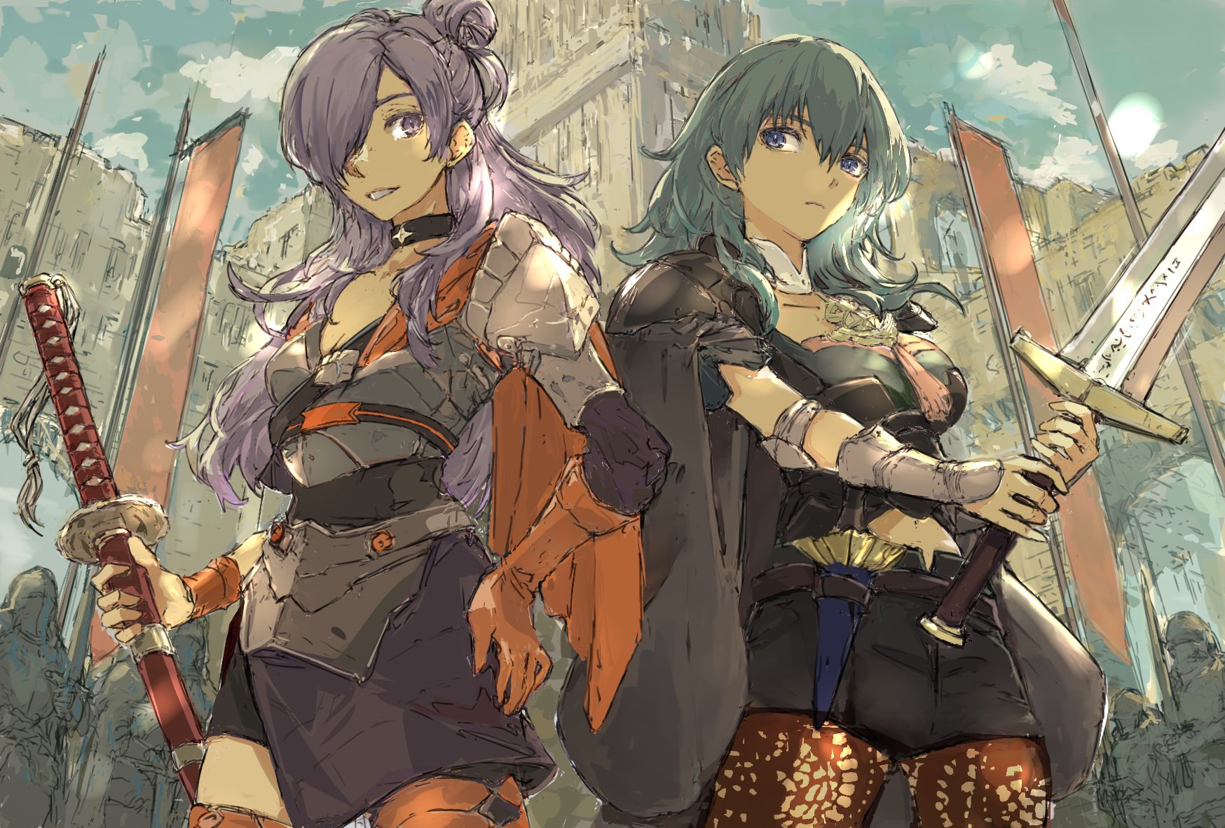 2girls blue_hair breasts cape cleavage female_byleth_(fire_emblem) female_shez_(fire_emblem) fire_emblem fire_emblem:_three_houses fire_emblem_warriors:_three_hopes flag hair_bun hair_over_one_eye hand_on_own_hip highres holding holding_sword holding_weapon katana long_hair medium_breasts medium_hair miniskirt multiple_girls nintendo nutori_manga single_hair_bun skirt sword weapon