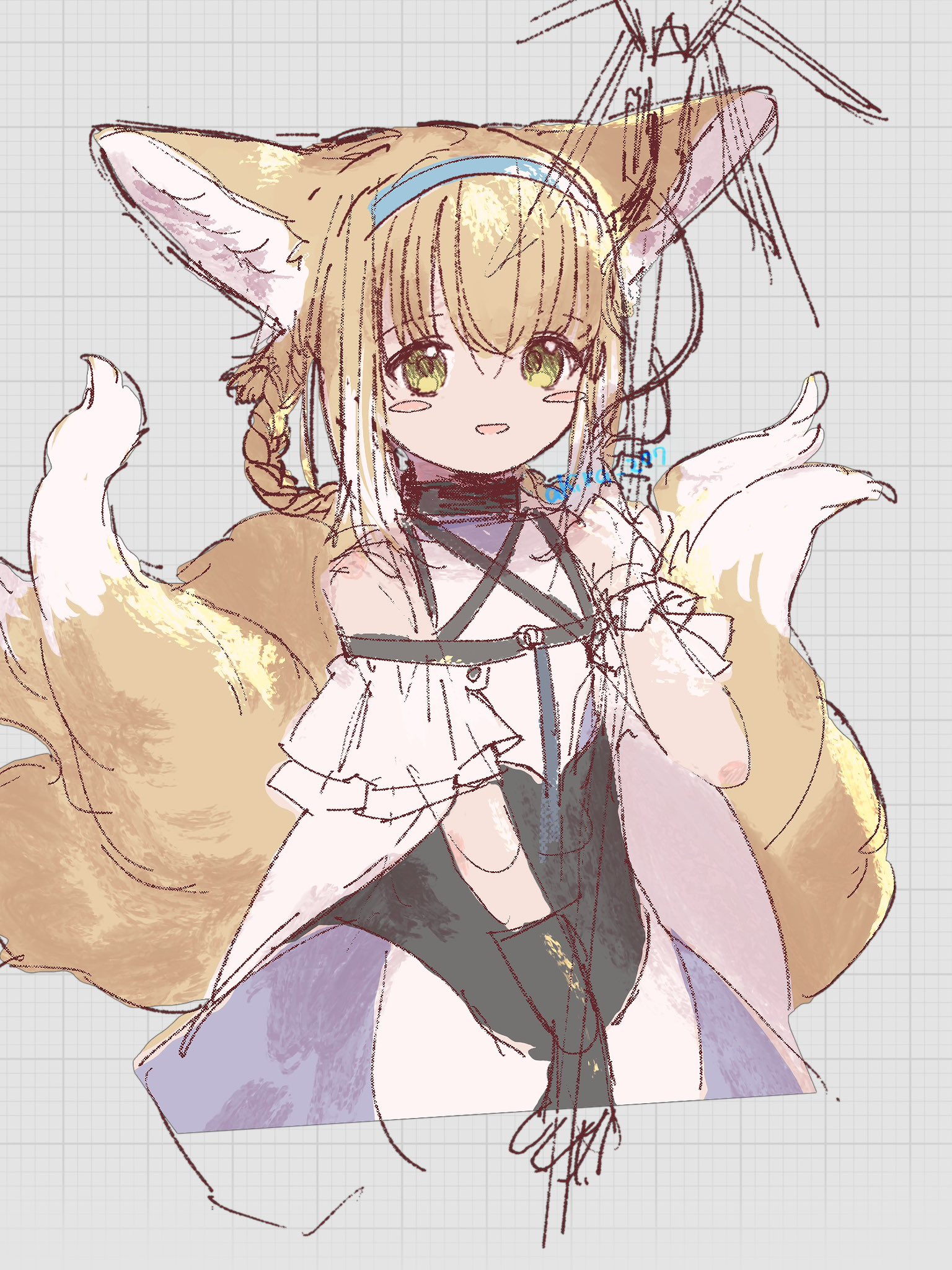 1girl animal_ears arknights black_gloves blonde_hair blue_hairband fox_ears fox_tail gloves green_eyes hairband highres niwatori_(akira_207) solo suzuran_(arknights) tail unfinished
