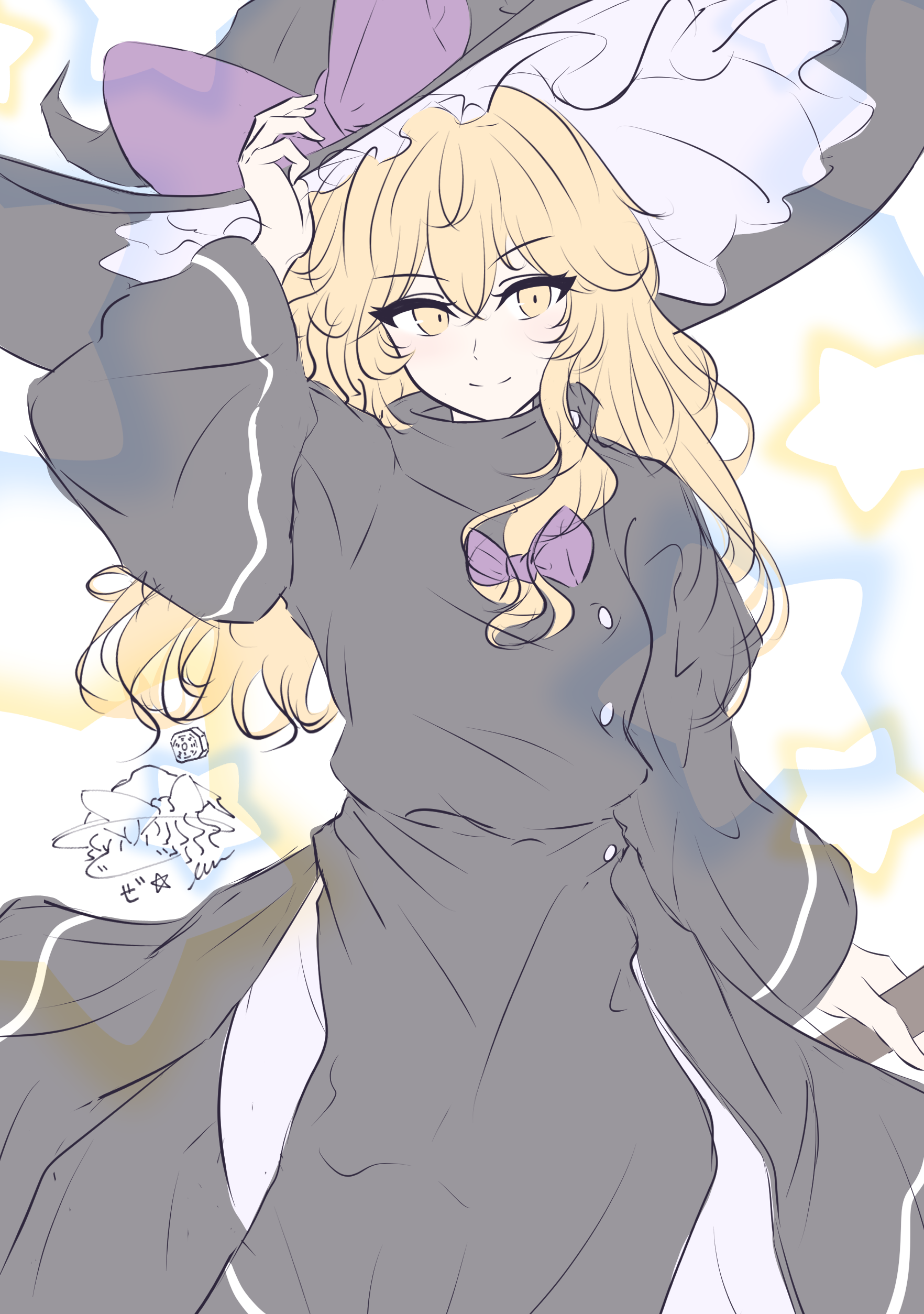 1girl absurdres alternate_costume black_dress blonde_hair bow closed_mouth commentary_request dress hair_bow hat hat_bow highres holding kirisame_marisa long_hair long_sleeves looking_at_viewer mini-hakkero purple_bow rinkaito1231 smile solo star_(symbol) touhou translation_request wide_sleeves witch_hat yellow_eyes