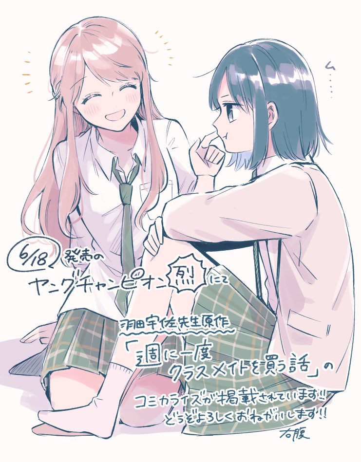 2girls blue_hair brown_hair cheek_poking choker closed_eyes commentary_request green_necktie green_skirt grey_jacket jacket long_hair long_sleeves migihara_(sgin001) miyagi_shiori multiple_girls necktie open_mouth plaid_clothes plaid_skirt pleated_skirt poking pout school_uniform sendai_hazuki shirt short_hair shuuniichido_classmate_wo_kau_hanashi sidelocks skirt socks translation_request white_shirt white_socks