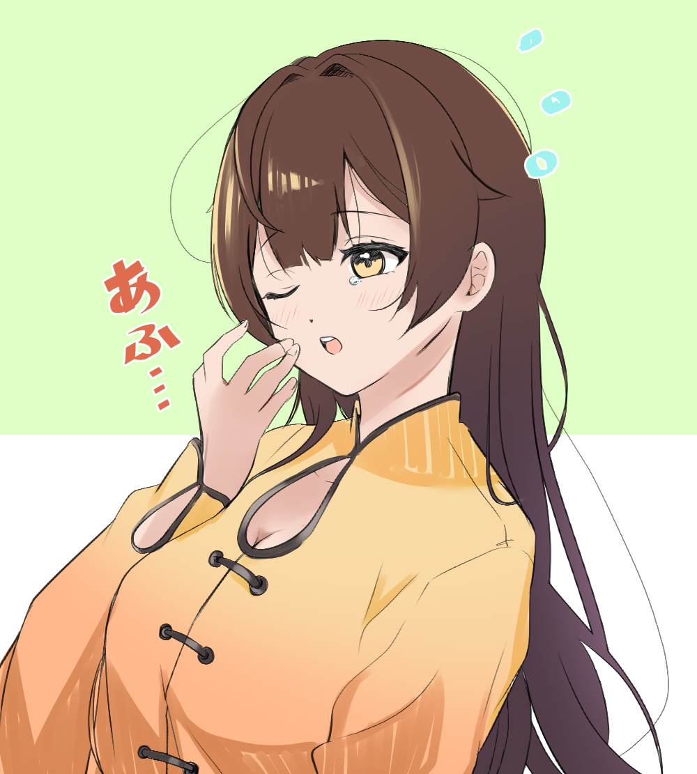 amamitsutsuki12 blush breasts brown_hair china_dress chinese_clothes dress honkai:_star_rail honkai_(series) large_breasts long_hair one_eye_closed open_mouth sushang_(honkai:_star_rail) upper_body yawning yellow_dress yellow_eyes