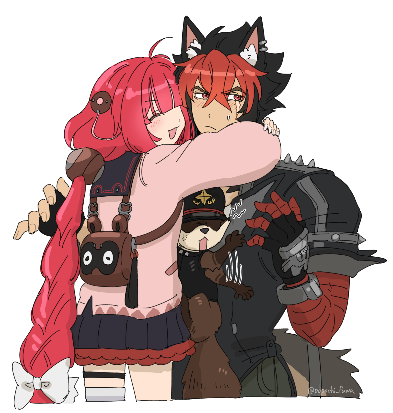 1boy 1girl 1other angry animal animal_between_breasts animal_ear_fluff animal_ears arms_around_neck backpack bag black_gloves black_hair black_skirt blush braid braided_twintails cardigan cargo_pants closed_eyes closed_mouth dog_boy dog_ears dog_tail ear_piercing fingerless_gloves gloves hair_between_eyes hair_ornament hair_ribbon hearing_aid highres hug kamanosuke_(zenless_zone_zero) komano_manato long_hair looking_to_the_side multicolored_hair multiple_scars muscular muscular_male nail_polish open_mouth pants pectorals piercing pink_cardigan popochi_fuwa raccoon red_bandage red_hair ribbon scar scar_across_eye scar_on_chest scar_on_face short_hair skirt sphere_hair_ornament spiked_jacket sweat sweatdrop tail tanuki thigh_strap twintails twitter_username ukinami_yuzuha white_background white_ribbon zenless_zone_zero