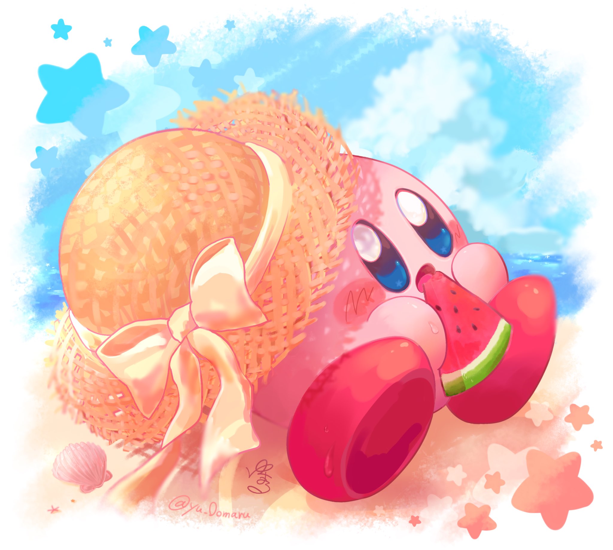 beach blue_eyes blue_sky blush_stickers border bow brown_hat cloud commentary_request eating food fruit hat hat_bow highres holding holding_food holding_fruit kirby kirby_(series) looking_at_viewer nintendo no_humans ocean open_mouth seashell shell signature sitting sky solo star_(symbol) straw_hat summer sun_hat twitter_username water_drop watermelon watermelon_slice white_border white_bow yu_0omaru