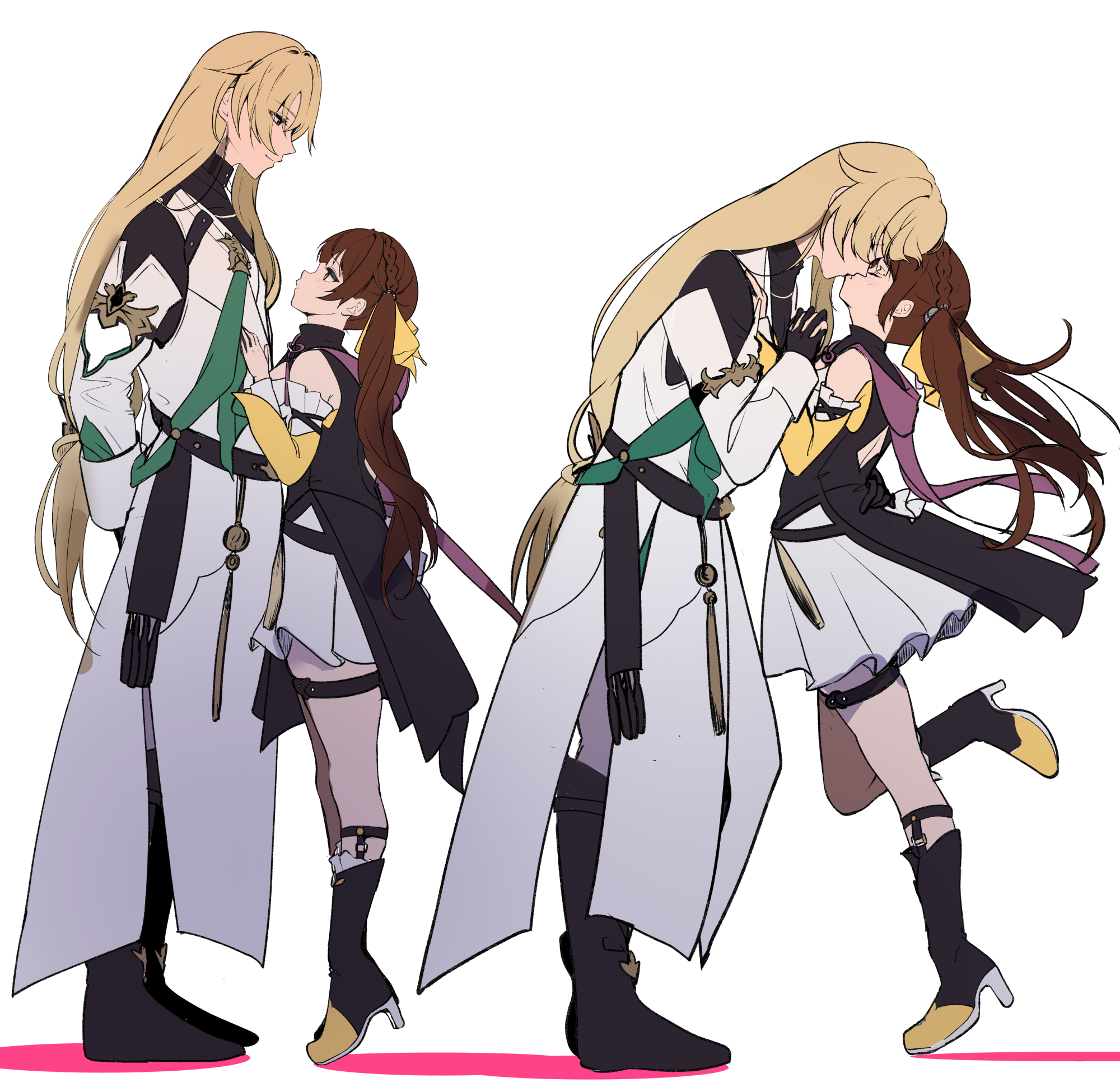 1boy 1girl amamitsutsuki12 bare_shoulders black_boots black_dress blonde_hair blush boots breasts brown_hair dress green_eyes hair_ornament highres holding_hands honkai:_star_rail honkai_(series) kiss leg_up long_hair luocha_(honkai:_star_rail) shirt sushang_(honkai:_star_rail) tall_male twintails white_shirt yellow_eyes