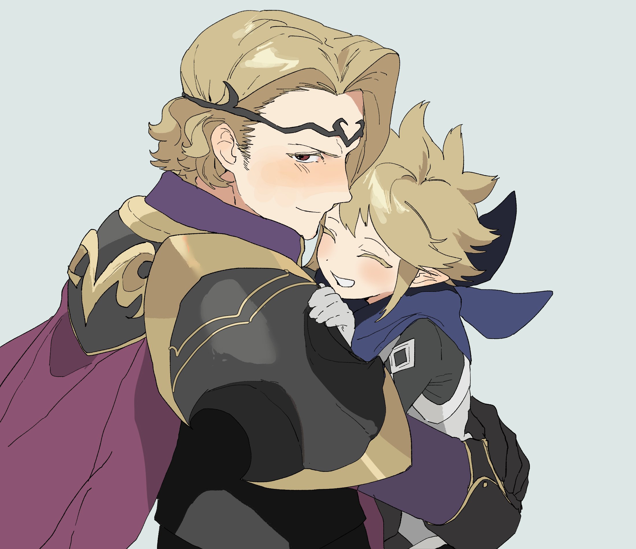 2boys armor aziemblemfates bandana bandana_around_neck black_armor blonde_hair blue_bandana circlet father_and_child father_and_son fire_emblem fire_emblem_fates highres hug male_kana_(fire_emblem) multiple_boys nintendo parent_and_child red_eyes upper_body xander_(fire_emblem)