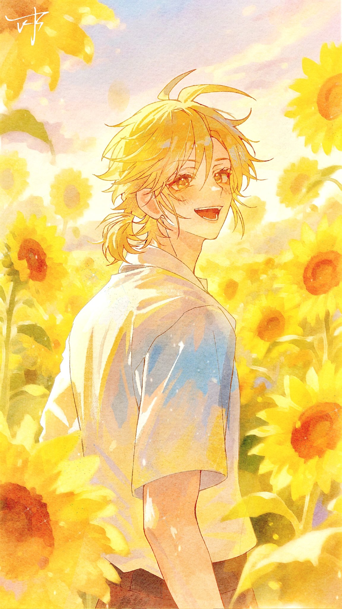 1boy antenna_hair blonde_hair brown_pants cowboy_shot flower hair_between_eyes highres kokuhaku_jikkou_iinkai looking_at_viewer looking_back male_focus medium_hair open_mouth pants ponytail shibasaki_aizou shirt short_ponytail short_sleeves smile solo sumi_wurenzaiyi sunflower white_shirt yellow_eyes yellow_flower