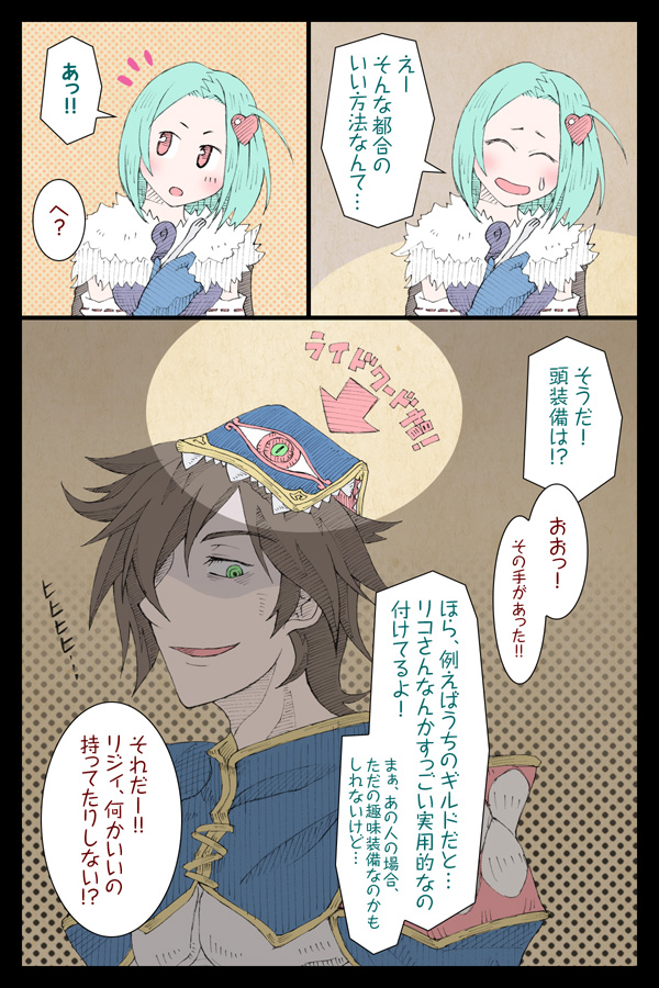1boy 1girl black_border blue_cape blue_gloves book book_on_head border brown_hair cape commentary_request creator_(ragnarok_online) fork fur_collar gloves green_eyes hair_ornament hair_over_one_eye heart heart_hair_ornament holding holding_fork object_on_head open_mouth pink_eyes ragnarok_online rideword_(ragnarok_online) saaki_(sa-ki) shaded_face short_hair translation_request upper_body