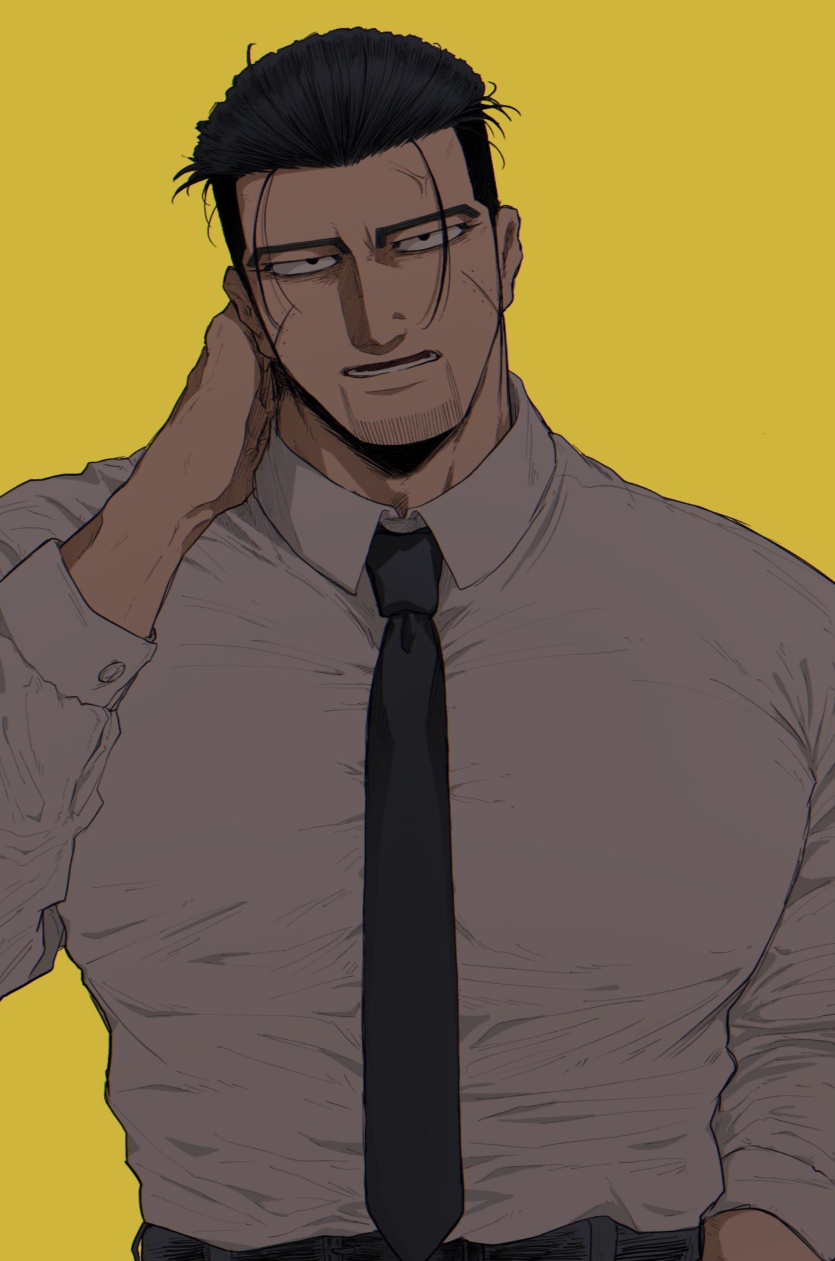 1boy bags_under_eyes black_hair black_necktie collared_shirt commentary_request covered_pectorals facial_hair goatee_stubble golden_kamuy high_contrast highres kameo_002 long_sleeves looking_at_viewer male_focus mature_male messy_hair necktie ogata_hyakunosuke open_mouth pectorals scar scar_on_face shirt short_hair simple_background solo stubble upper_body white_shirt yellow_background
