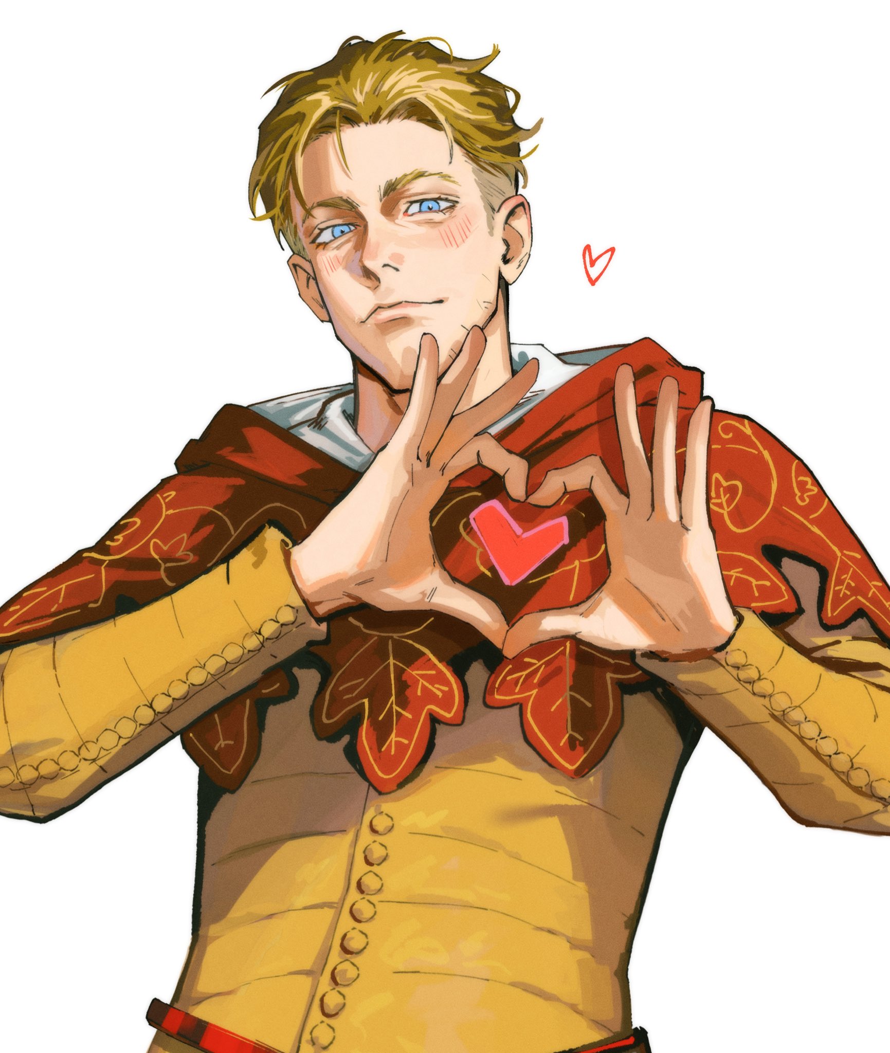1boy blonde_hair blue_eyes hans_capon heart heart_hands highres kingdom_come:_deliverance kingdom_come:_deliverance_ii male_focus pp46 solo solo_focus twitter white_background