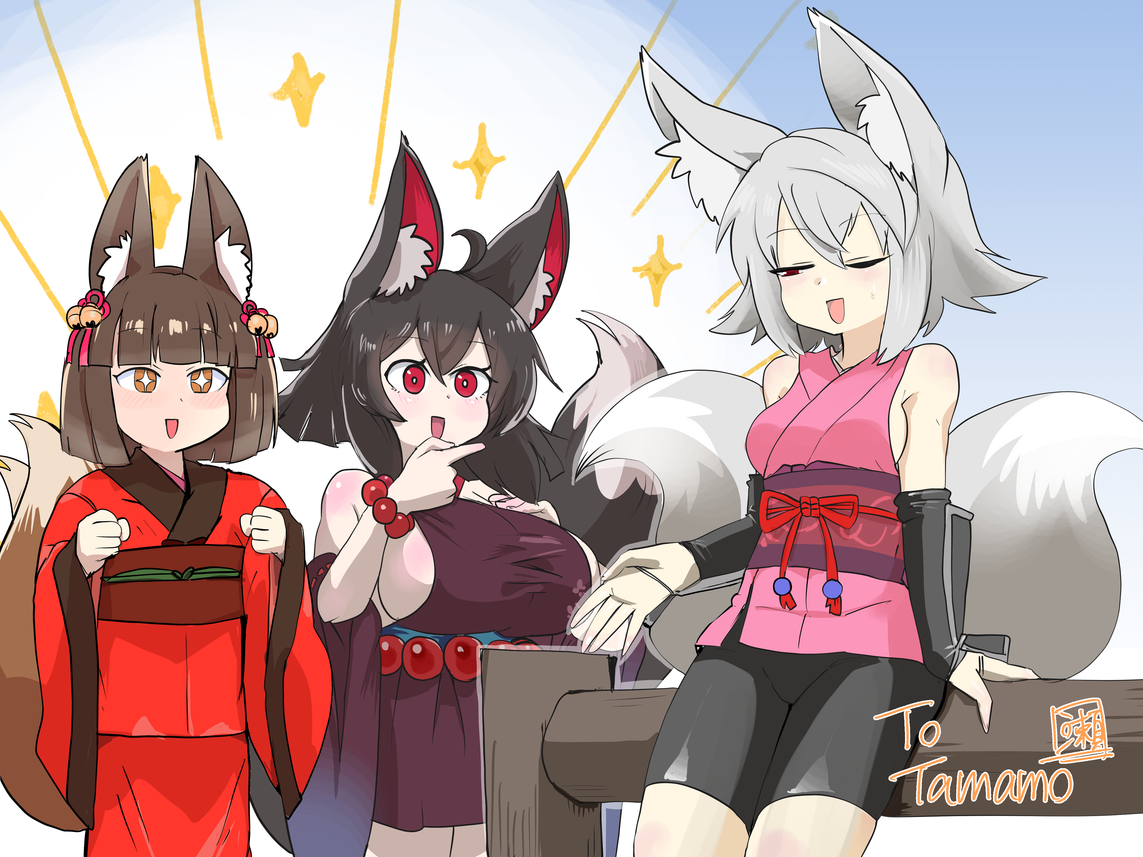 3girls :d absurdres animal_ears bead_bracelet beads bell black_hair black_tail bracelet breasts brown_hair brown_tail commission detached_sleeves fox_ears fox_girl fox_tail hair_bell hair_ornament highres japanese_clothes jewelry kamuro_(mon-musu_quest!) katsumi_(tamamo) kimono kitsu_(mon-musu_quest!) kitsune mon-musu_quest! mon-musu_quest:_paradox multiple_girls one_eye_closed open_mouth original red_eyes ribbon setouchi_(blackse) short_hair sideboob skeb_commission smile sparkle_background sparkling_eyes tail thinking white_hair white_tail yellow_eyes