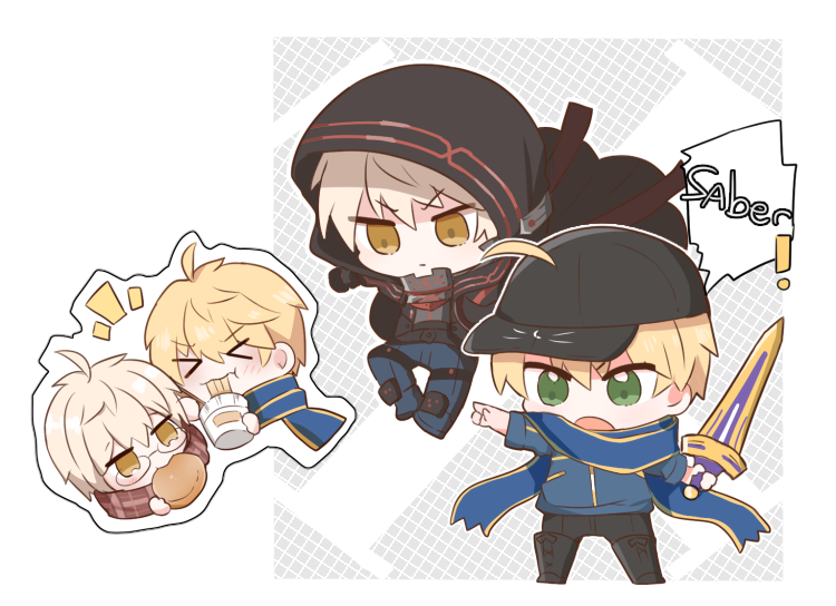 ! 2boys ahoge armor arthur_pendragon_(fate) arthur_pendragon_alter_(fate) black-framed_eyewear black_boots black_coat black_hat black_pants blonde_hair blue_jacket blue_pants blue_scarf blush blush_stickers boots breastplate brown_eyes brown_scarf bun_(food) chibi chibi_only chopsticks closed_eyes closed_mouth coat cup instant_cup_noodles dual_persona eating english_text excalibur_(fate/prototype) fate/grand_order fate_(series) floating_clothes food full_body glasses green_eyes grey_armor hair_between_eyes hands_up hat holding holding_chopsticks holding_cup holding_food hood hooded_coat instant_cup_noodles instant_noodles jacket male_focus multiple_boys multiple_views noodles notice_lines open_clothes open_coat open_mouth pants plaid_clothes plaid_scarf pointing rabi_(swordofthestone) scarf short_hair speech_bubble standing sword thigh_strap track_jacket v-shaped_eyebrows visor_cap weapon