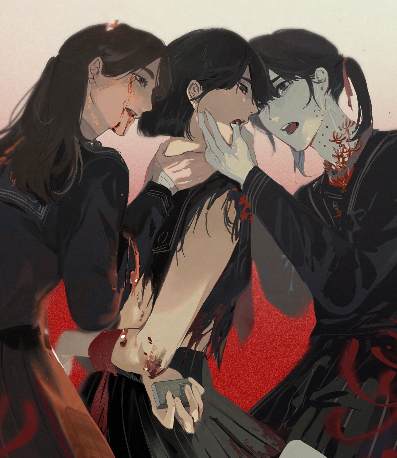 22_(22mimi2434) 3girls arms_behind_back black_eyes black_hair black_sailor_collar blood blood_from_mouth bloody_tears bound bound_arms commentary flower half_updo highres holding igarashi_sakuko multiple_girls nishida_rinko open_mouth red_pupils sailor_collar school_uniform serafuku shimizu_hinako short_hair silent_hill_(series) silent_hill_f spider_lily twintails