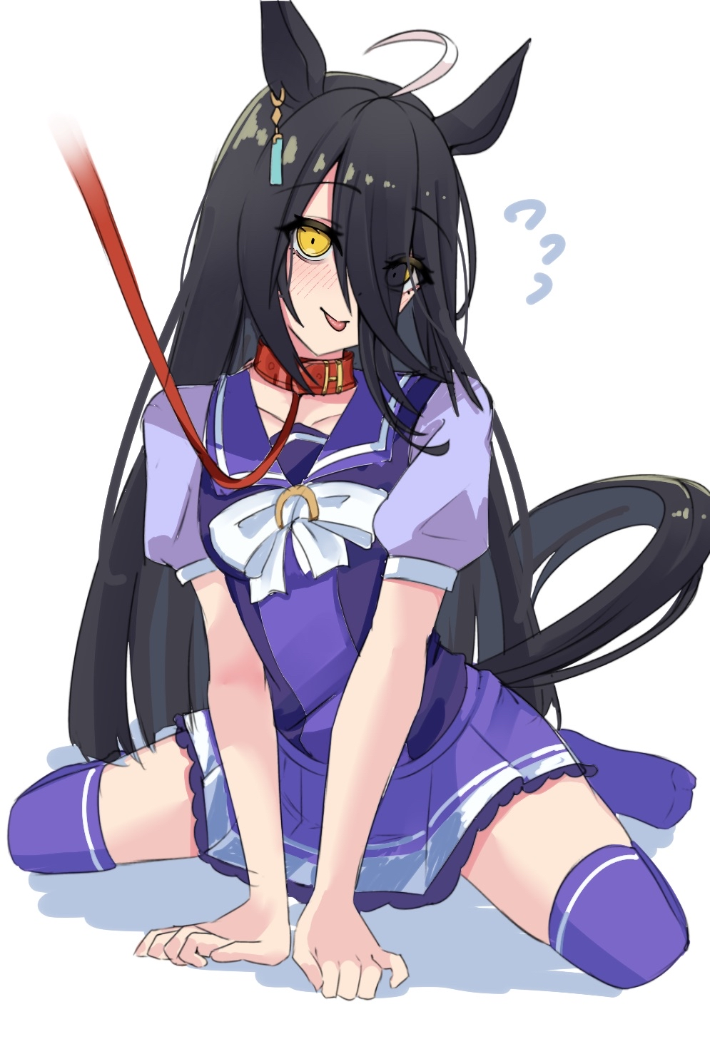 1girl ahoge animal_ears black_hair blush bow bowtie closed_mouth collar ear_ornament ear_tag earrings flying_sweatdrops hair_between_eyes hands_on_ground highres horse_ears horse_girl horse_tail jewelry leash lengkuass long_hair long_hair_between_eyes looking_at_viewer manhattan_cafe_(umamusume) multicolored_hair no_shoes pleated_skirt puffy_short_sleeves puffy_sleeves purple_sailor_collar purple_shirt purple_skirt purple_thighhighs red_collar sailor_collar shirt short_sleeves simple_background single_earring sitting skirt tail thighhighs tongue tongue_out umamusume very_long_hair viewer_holding_leash wariza white_background white_bow white_bowtie white_hair yellow_eyes