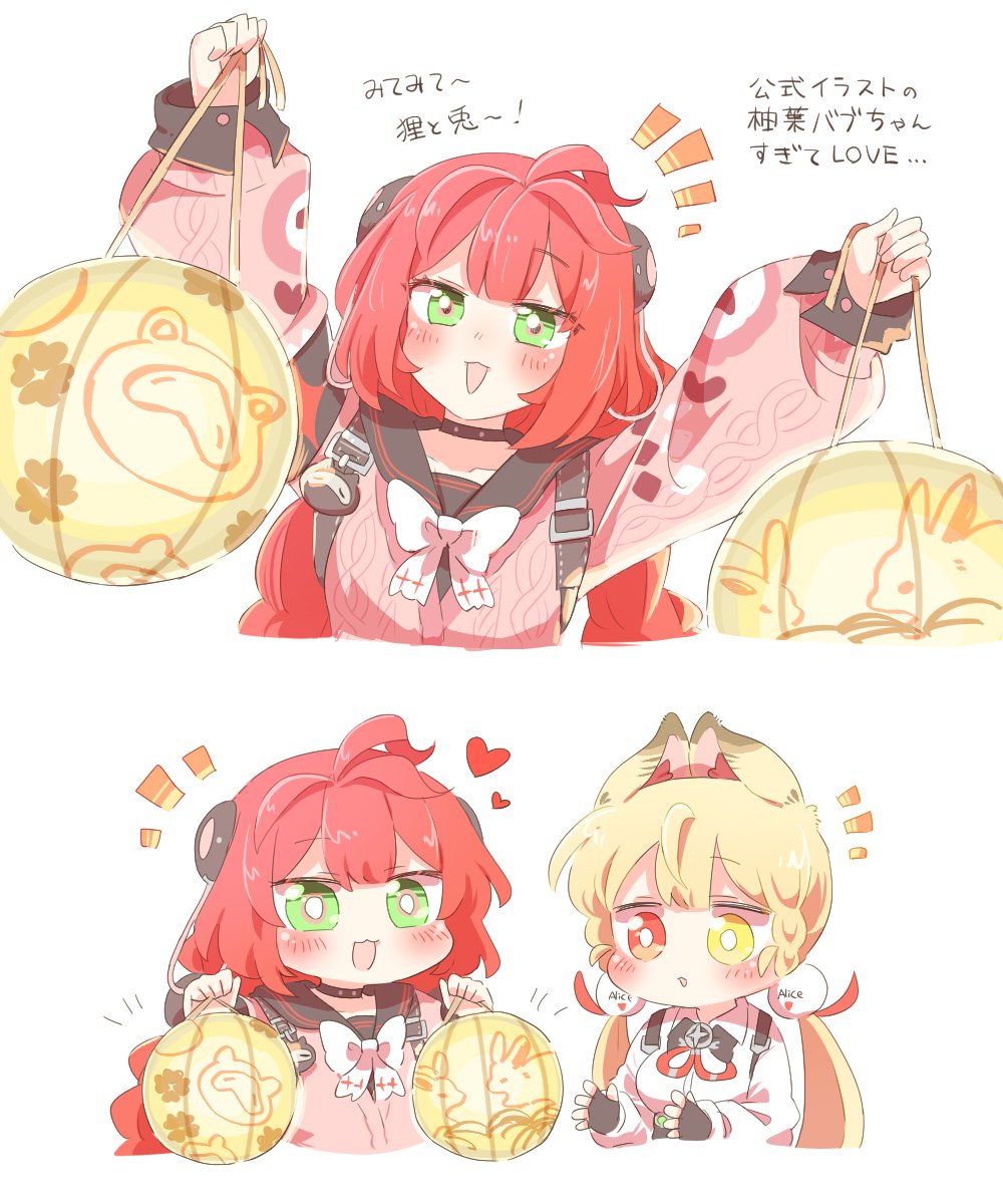 2girls alice_thymefield animal_ears arms_up backpack bag belt black_gloves black_sailor_collar blonde_hair blush braid braided_twintails cardigan chest_bow fingerless_gloves gloves green_eyes hair_ornament hearing_aid heart heterochromia highres holding holding_lantern lantern long_hair looking_at_another looking_at_viewer multiple_girls notice_lines open_mouth paper_lantern pink_cardigan rabbit_ears rabbit_girl rebecca_(keinelove) red_eyes red_hair sailor_collar shirt sphere_hair_ornament twintails ukinami_yuzuha white_background white_shirt yellow_eyes zenless_zone_zero