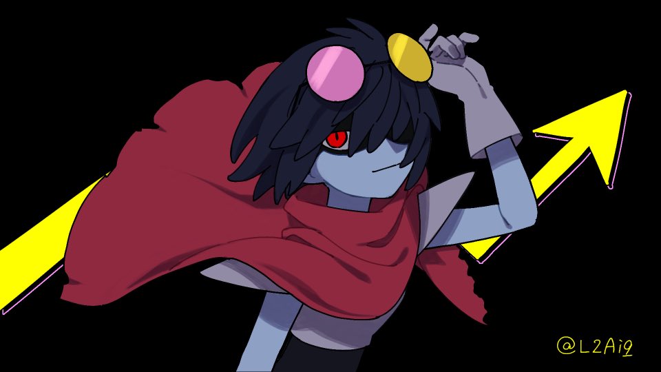 1other armor arrow_(symbol) black_hair blue_skin cape colored_skin dealmaker_(deltarune) deltarune eyewear_on_head gloves grey_gloves heterochromatic_eyewear kris_(dark_world)_(deltarune) kris_(deltarune) l2aiq looking_at_viewer partially_shaded_face red_cape red_eyes short_hair solo tinted_eyewear torn_cape torn_clothes twitter_username upper_body utdr_(toby_fox)