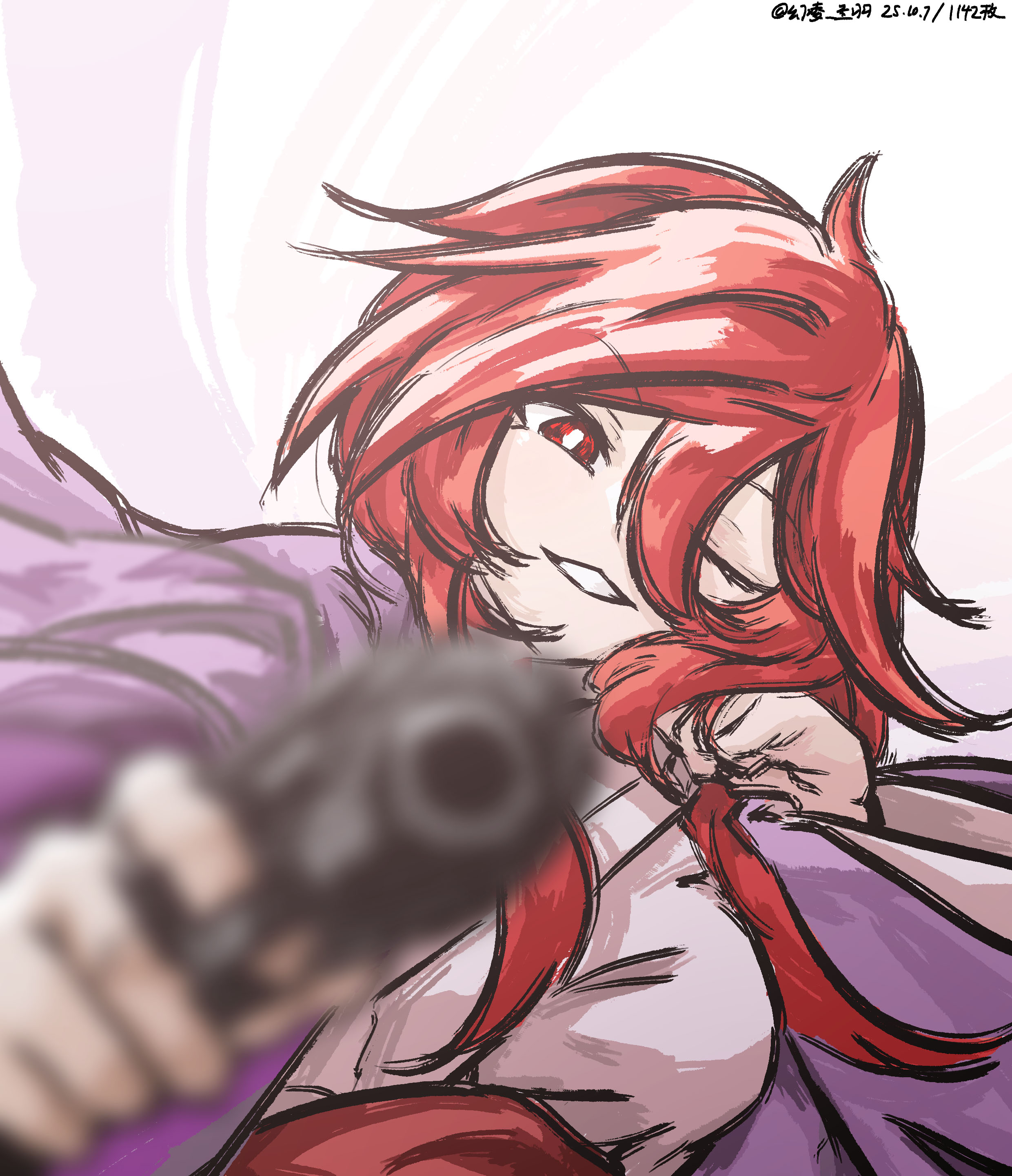 1girl absurdres aiming blurry blurry_foreground depth_of_field hair_between_eyes highres japanese_clothes kimono kotohime_(touhou) long_hair looking_at_viewer one-hour_drawing_challenge one_eye_closed pointing pointing_at_viewer purple_kimono red_eyes red_hair smile touhou touhou_(pc-98) upper_body ve1024 white_kimono wide_sleeves