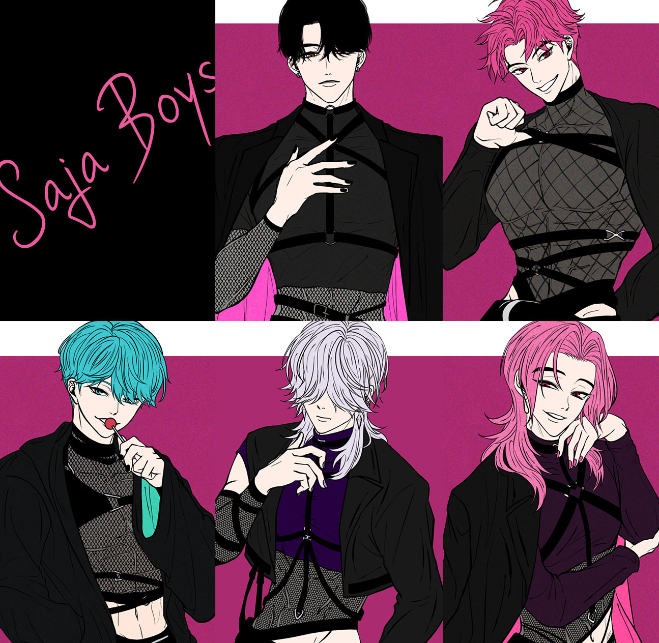 5boys abby_(kpop_demon_hunters) aqua_eyes aqua_hair baby_(kpop_demon_hunters) bad_id bad_twitter_id black_hair candy earrings fishnet_top fishnets food group_name hair_over_eyes hair_over_one_eye highres holding holding_candy holding_food holding_lollipop jewelry jinu_(kpop_demon_hunters) kpop_demon_hunters lollipop male_focus medium_hair multiple_boys mystery_(kpop_demon_hunters) pink_hair pink_nails pkkjn8 red_eyes romance_(kpop_demon_hunters) smile upper_body