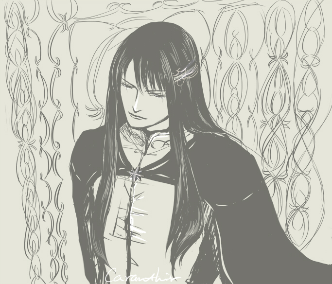 1boy black_cape black_hair cape caranthir character_name closed_mouth eilian long_hair male_focus monochrome solo the_silmarillion tolkien's_legendarium upper_body