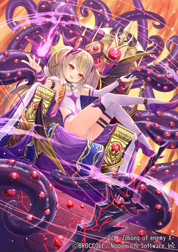 1girl blonde_hair chair copyright_notice energy_ball hair_ornament hastur_(z/x) leotard official_art on_chair purple_leotard purple_shoes red_eyes shoes sitting sword tadokoro_teppei tentacles thighhighs tongue tongue_out twintails weapon white_thighhighs z/x