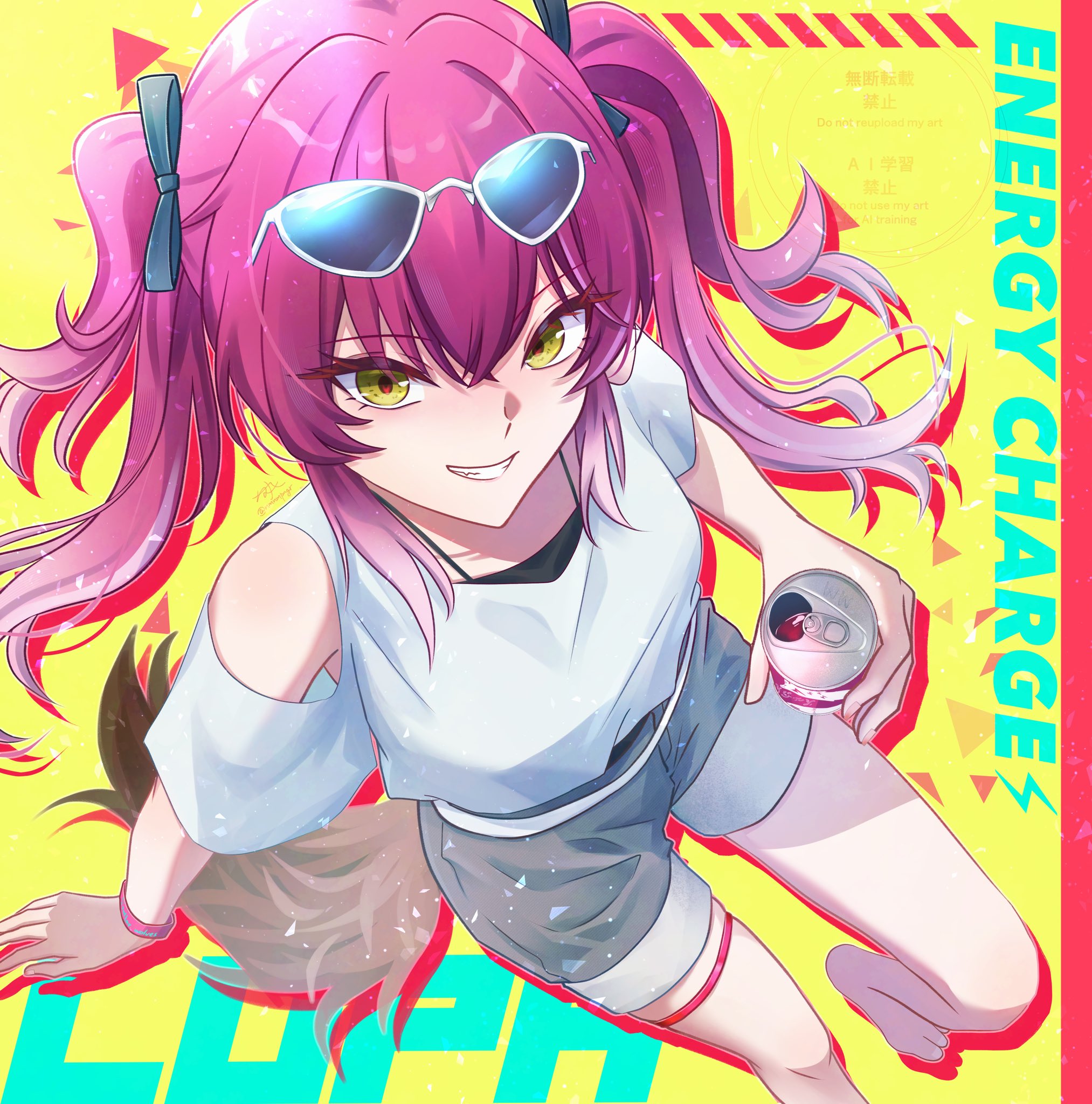 1girl alternate_costume can casual character_name clothing_cutout commentary_request drink_can eyewear_on_head from_above grey_shorts grin highres holding holding_can long_hair looking_at_viewer looking_up lupa_(wuthering_waves) nmnmpngr red_hair shirt short_sleeves shorts shoulder_cutout smile soda_can solo tail twintails white_shirt wolf_girl wolf_tail wuthering_waves yellow_eyes