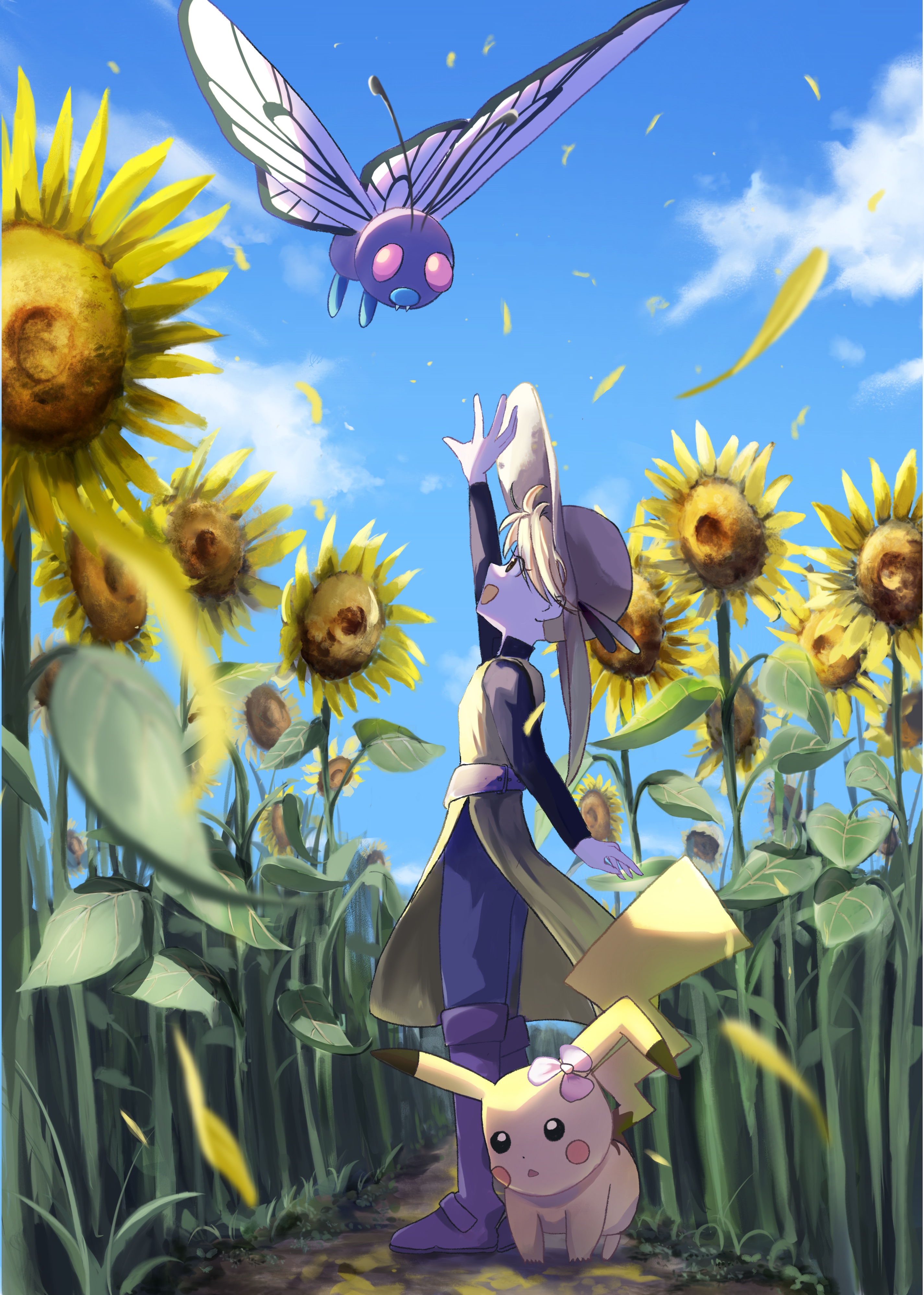 1girl :d absurdres arm_up black_shirt blonde_hair boots butterfree cloud commentary_request day falling_petals flower gen_1_pokemon hat highres long_hair looking_up motion_blur nintendo open_mouth outdoors pants petals pikachu pokemon pokemon_(creature) pokemon_adventures pure_(jxdm4327) purple_boots shirt sky smile standing summer sun_hat sunflower yellow_(pokemon)