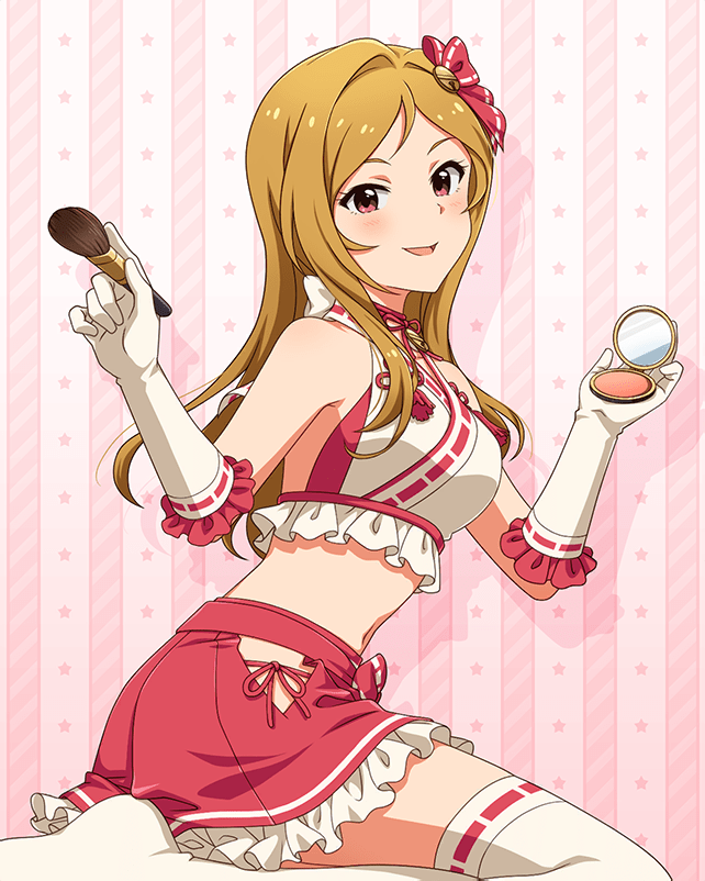 1girl brown_hair card_(medium) concept_maihime_(idolmaster) frilled_skirt frills gloves hair_ornament hand_mirror holding idolmaster idolmaster_million_live! idolmaster_million_live!_theater_days japanese_clothes makeup_brush mirror momose_rio navel official_art open_mouth red_eyes skirt solo thighhighs white_gloves white_thighhighs