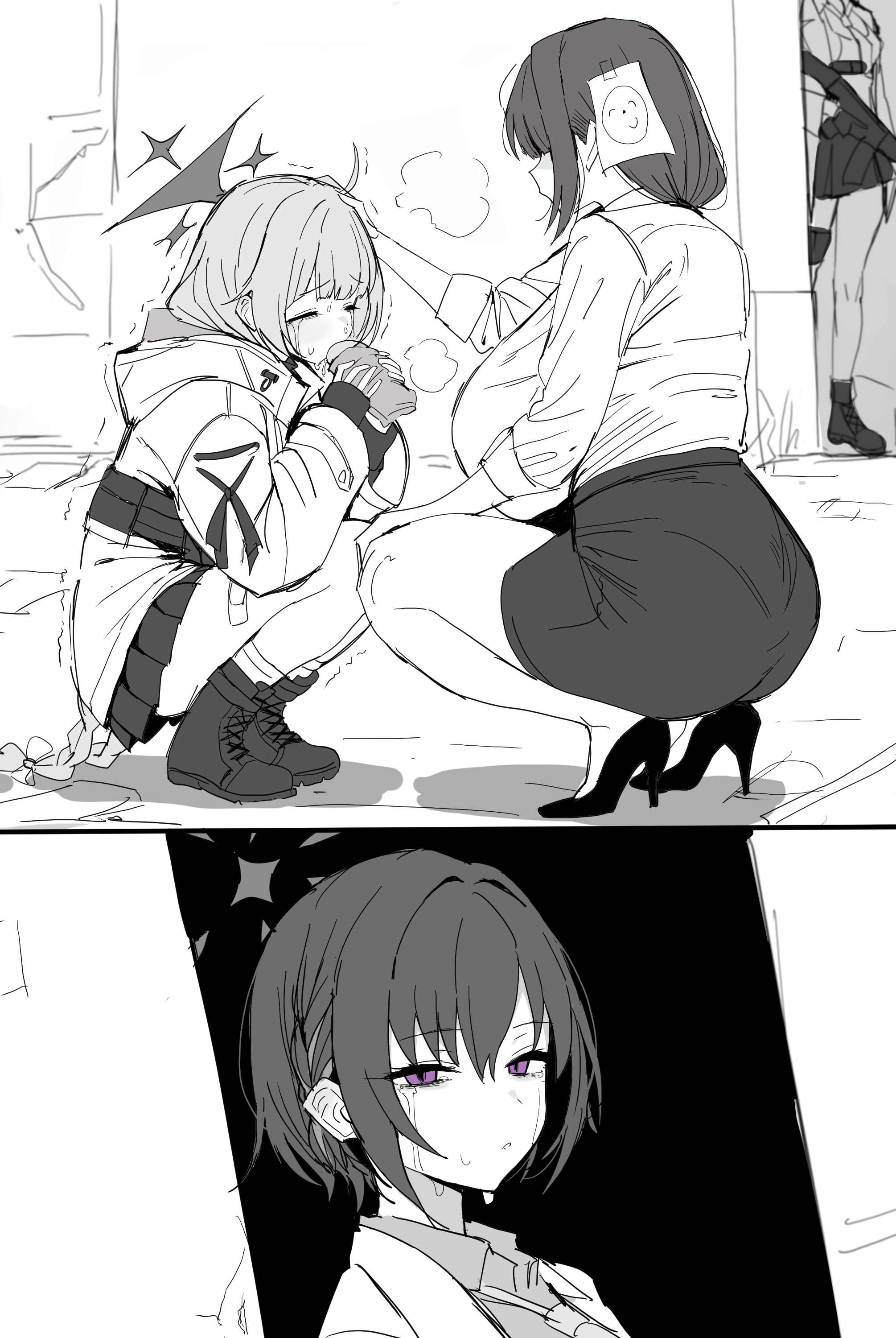 3girls absurdres blue_archive blush breasts commentary_request doodle_sensei_(blue_archive) female_sensei_(blue_archive) female_sensei_(blue_archive)_(xipa) food greyscale gun halo highres holding holding_food holding_gun holding_weapon huge_breasts jacket long_sleeves maia_(blue_archive) monochrome multiple_girls sensei_(blue_archive) shirt shoes short_hair skirt squatting subaru_(blue_archive) tears weapon xipa