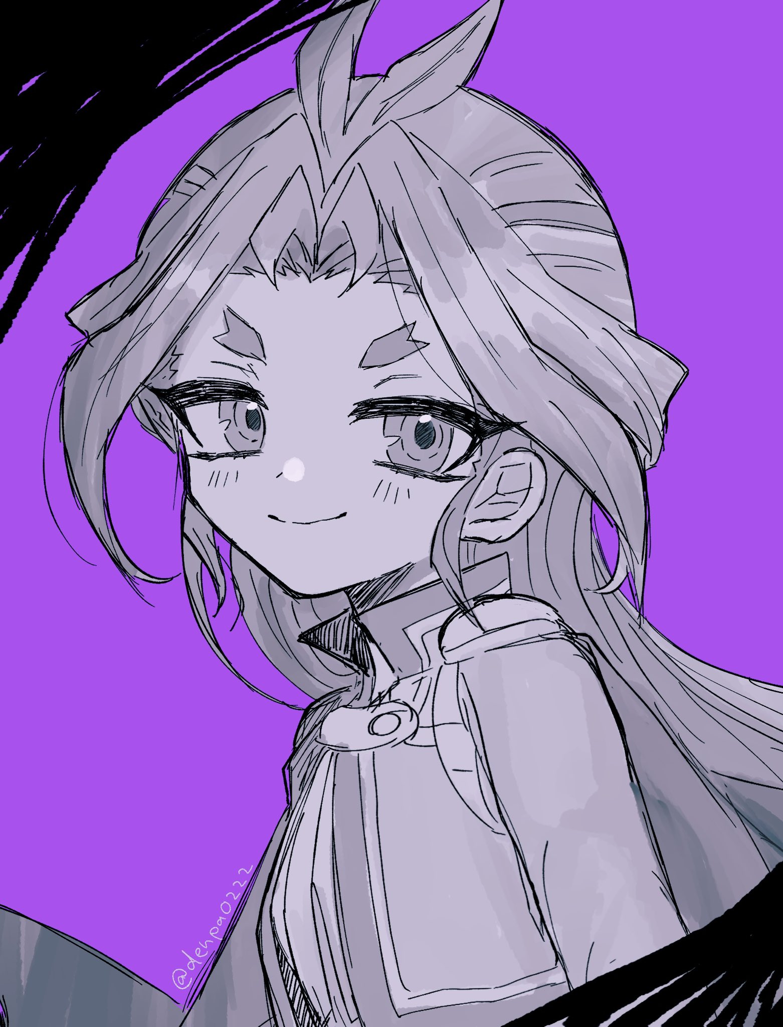 1girl denpa0222 genderswap genderswap_(mtf) greyscale_with_colored_background highres joeri_(yu-gi-oh!) purple_background simple_background smile solo twitter_username upper_body yu-gi-oh! yu-gi-oh!_arc-v