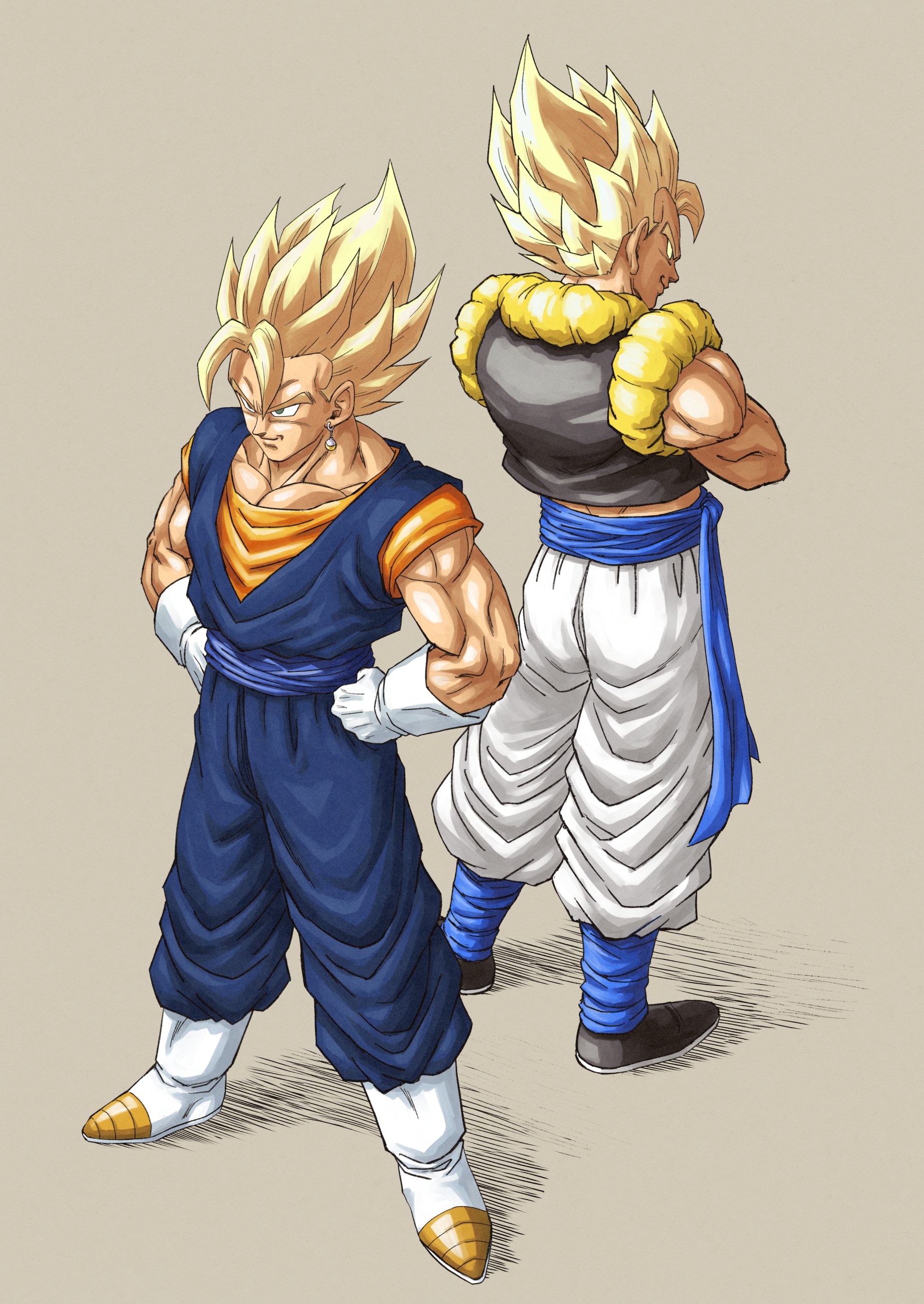 2boys absurdres back-to-back blonde_hair blue_pants blue_sash blue_shirt boots cropped_vest dougi dragon_ball dragonball_z earrings full_body gloves gogeta grey_background highres jewelry male_focus medium_hair metamoran_vest multiple_boys muscular muscular_male nagare_seiya no_shirt orange_shirt pants potara_earrings sash shirt simple_background spiked_hair super_saiyan super_saiyan_1 vegetto vest white_boots white_gloves white_pants