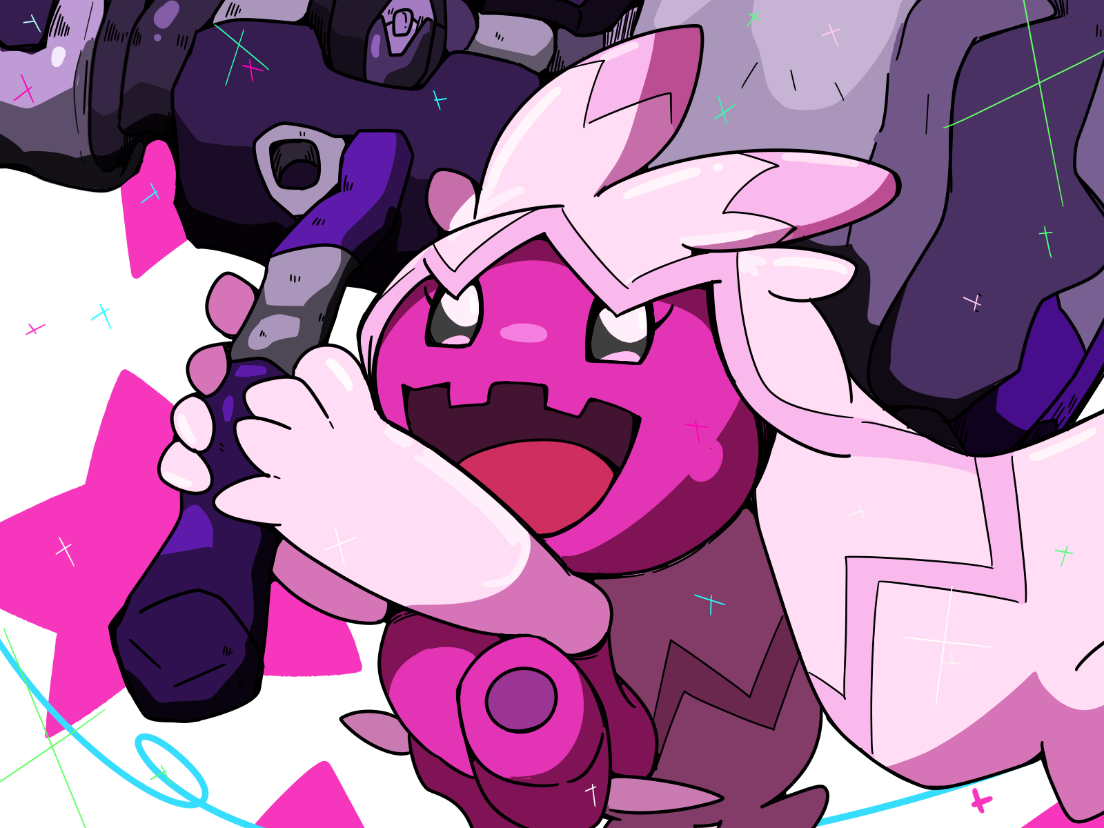 :d black_eyes hammer highres holding holding_hammer michikusa_mawari nintendo no_humans open_mouth pokemon pokemon_(creature) smile solo standing star_(symbol) tinkaton