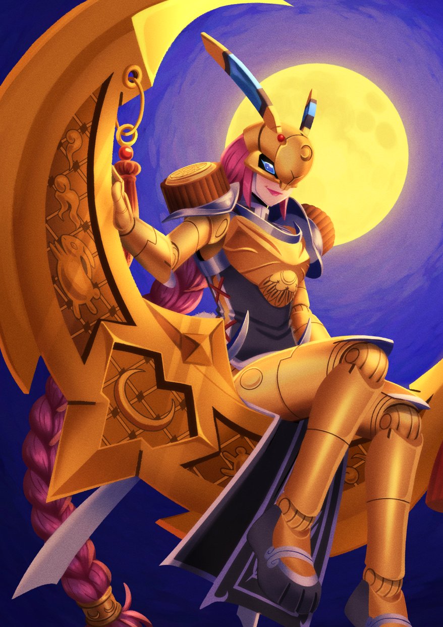 1girl armor blue_eyes braid crescent digimon digimon_(creature) full_moon gold_armor gold_helmet highres jougamon long_hair moon night pink_hair shenani sitting solo