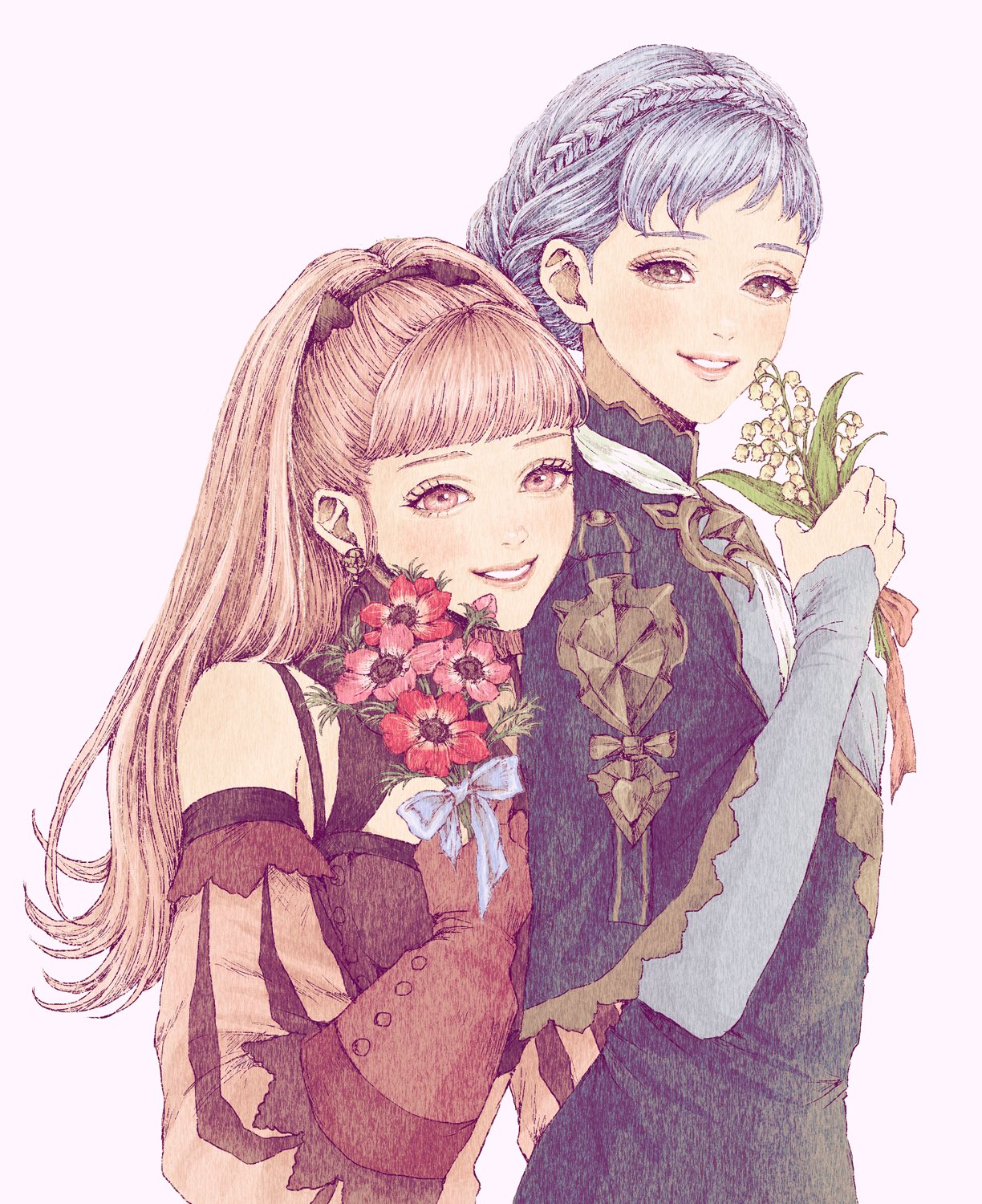 2girls blue_capelet blue_dress blue_hair braid breasts brown_eyes capelet crown_braid dress earrings fire_emblem fire_emblem:_three_houses flower gloves hair_bun highres hilda_valentine_goneril hilda_valentine_goneril_(timeskip) holding holding_flower jewelry long_hair long_sleeves looking_at_viewer marianne_von_edmund marianne_von_edmund_(timeskip) mgmg_g_zzz multiple_girls nintendo open_mouth pink_eyes pink_hair ponytail red_gloves short_hair simple_background smile upper_body