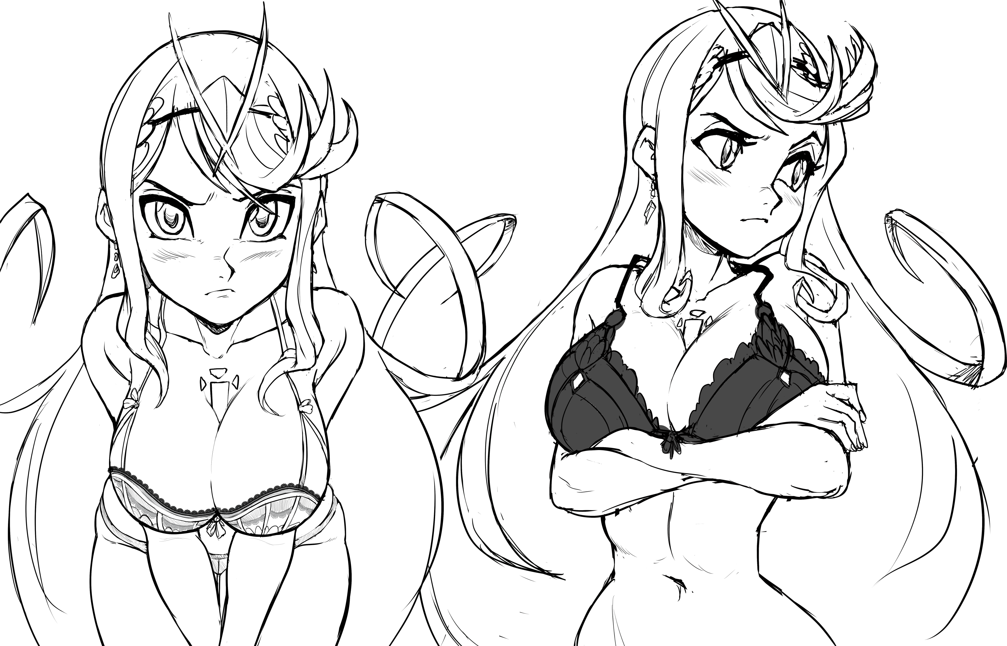 absurdres blush bra breasts circlet cleavage crossed_arms highres large_breasts leaning_forward long_hair looking_at_viewer looking_to_the_side mythra_(xenoblade) navel panties sketch teevo underwear xenoblade_chronicles_(series) xenoblade_chronicles_2