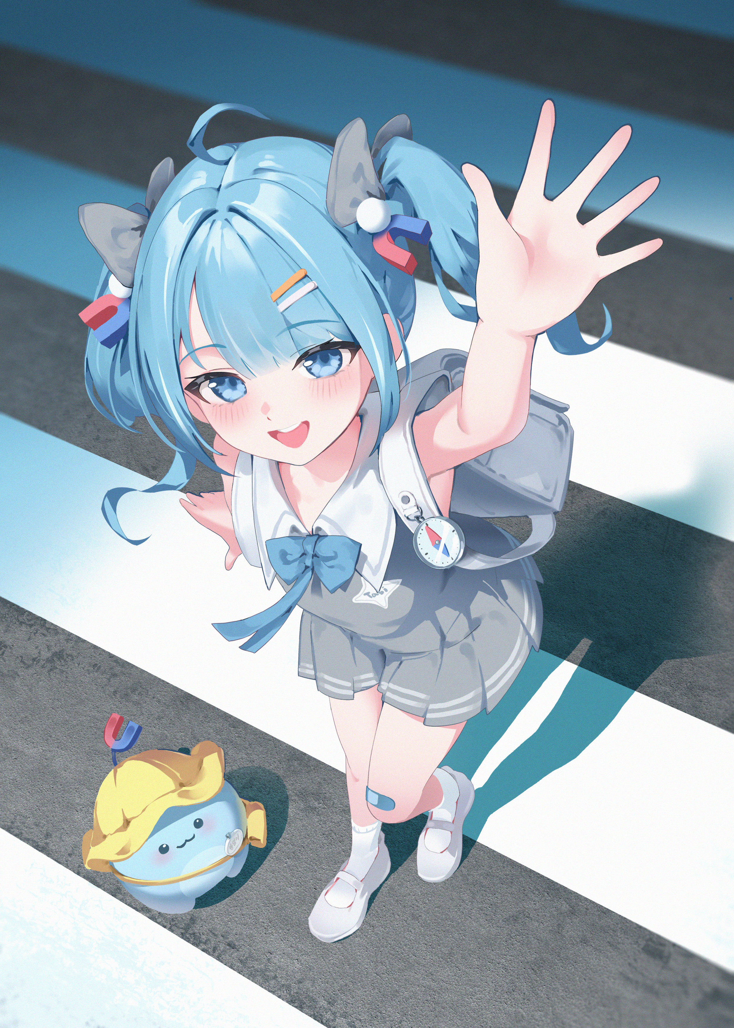 1girl absurdres arahashi_tabi backpack bag bandaid bandaid_on_knee bandaid_on_leg blue_bow blue_bowtie blue_hair blush bow bowtie collared_dress commentary compass creature crosswalk dress foreshortening from_above full_body grey_bow grey_dress hair_bow hair_ornament hairclip hat highres kamonari_ahiru looking_at_viewer looking_up magnet_hair_ornament mary_janes medium_hair open_mouth outdoors parallel_hairclips parted_lips pleated_dress pungdangi_(arahashi_tabi) school_uniform shadow shoes short_dress sleeveless sleeveless_dress smile socks stellive thumbsup_stella virtual_youtuber white_shoes white_socks yellow_hat
