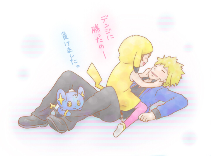 1boy 1girl blonde_hair brown_hair closed_eyes cosplay emiko_(lovee) full_body gen_1_pokemon gen_4_pokemon lying nintendo pikachu pikachu_(cosplay) poke_kid_(pokemon) pokemon pokemon_(creature) pokemon_diamond/pearl/platinum shinx spiked_hair translation_request volkner_(pokemon)