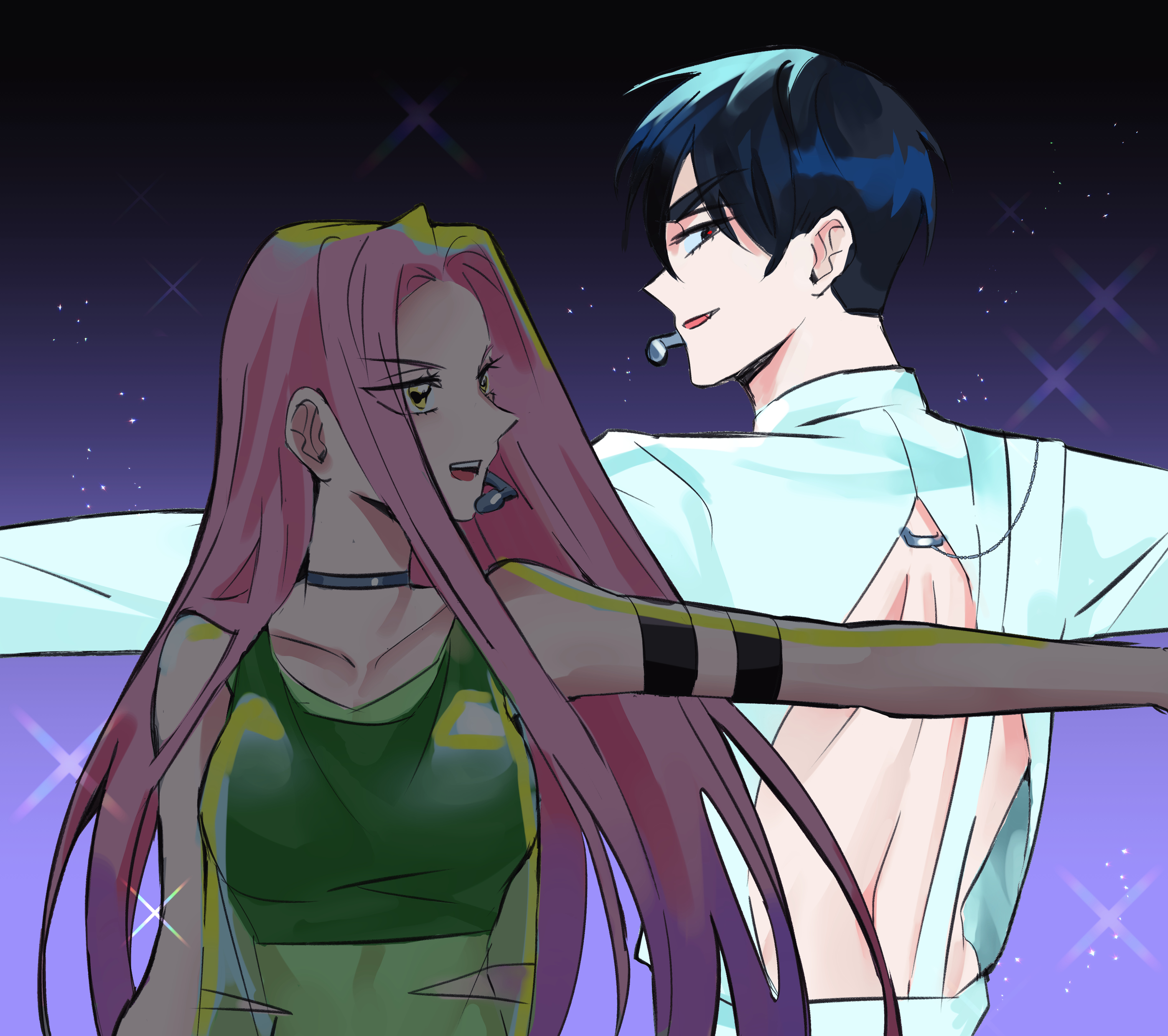 1boy 1girl absurdres album_cover_redraw alien_stage armband back_cutout black_bra black_eyes black_hair bra breasts choker clothing_cutout commentary cosplay derivative_work etc_o2 green_tank_top grey_choker hashtag-only_commentary headset highres ivan_(alien_stage) jacket long_hair luka_(alien_stage) luka_(alien_stage)_(cosplay) microphone mizi_(alien_stage) multicolored_hair open_mouth outstretched_arm pink_hair purple_background purple_hair red_pupils see-through_tank_top short_hair tank_top till_(alien_stage) till_(alien_stage)_(cosplay) two-tone_hair underwear very_long_hair very_short_hair white_jacket yellow_eyes