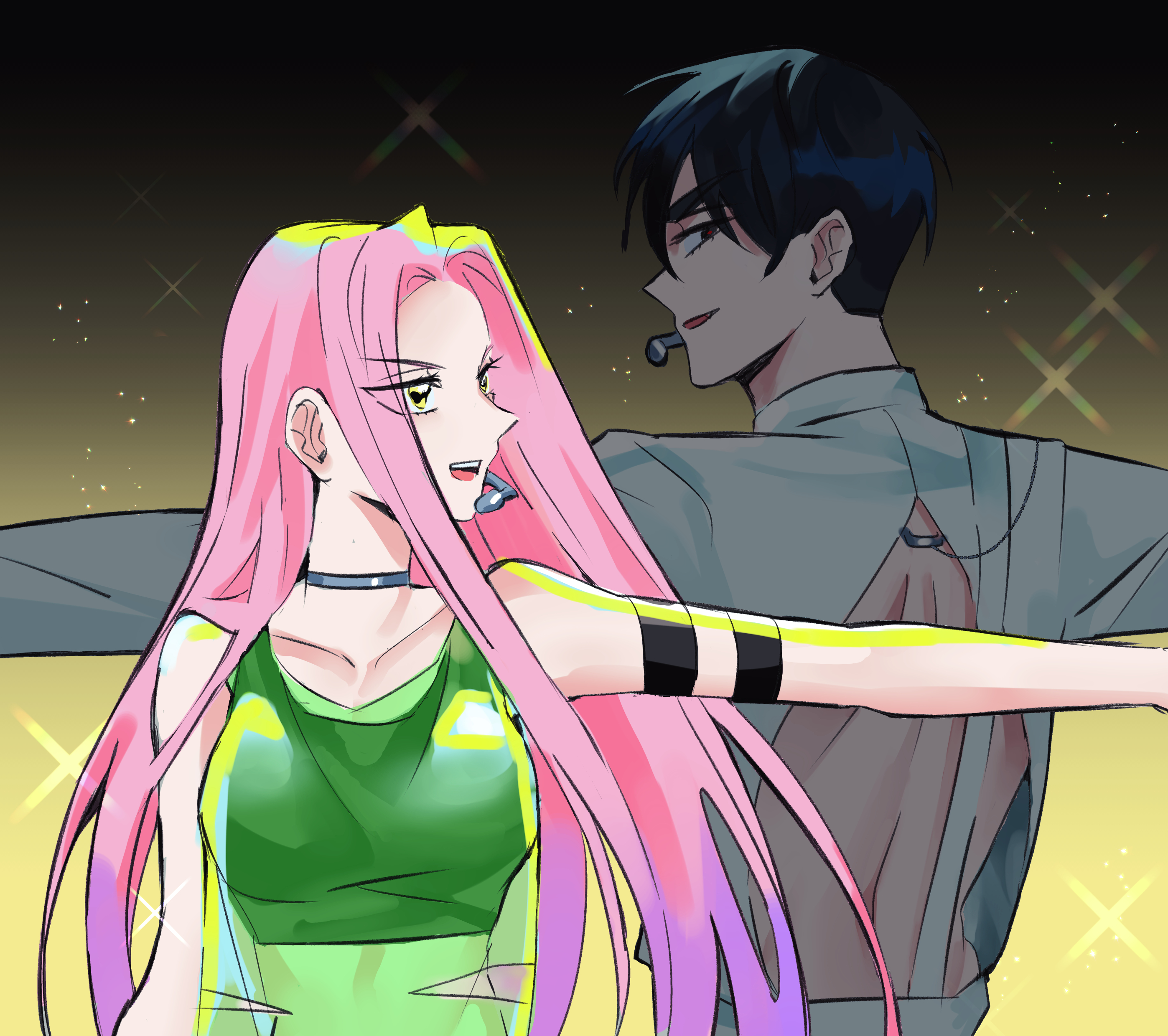 1boy 1girl absurdres album_cover_redraw alien_stage armband back_cutout black_bra black_eyes black_hair bra breasts choker clothing_cutout commentary cosplay derivative_work etc_o2 green_tank_top grey_choker hashtag-only_commentary headset highres ivan_(alien_stage) jacket long_hair luka_(alien_stage) luka_(alien_stage)_(cosplay) microphone mizi_(alien_stage) multicolored_hair open_mouth outstretched_arm pink_hair purple_hair red_pupils see-through_tank_top short_hair tank_top till_(alien_stage) till_(alien_stage)_(cosplay) two-tone_hair underwear very_long_hair very_short_hair white_jacket yellow_background yellow_eyes