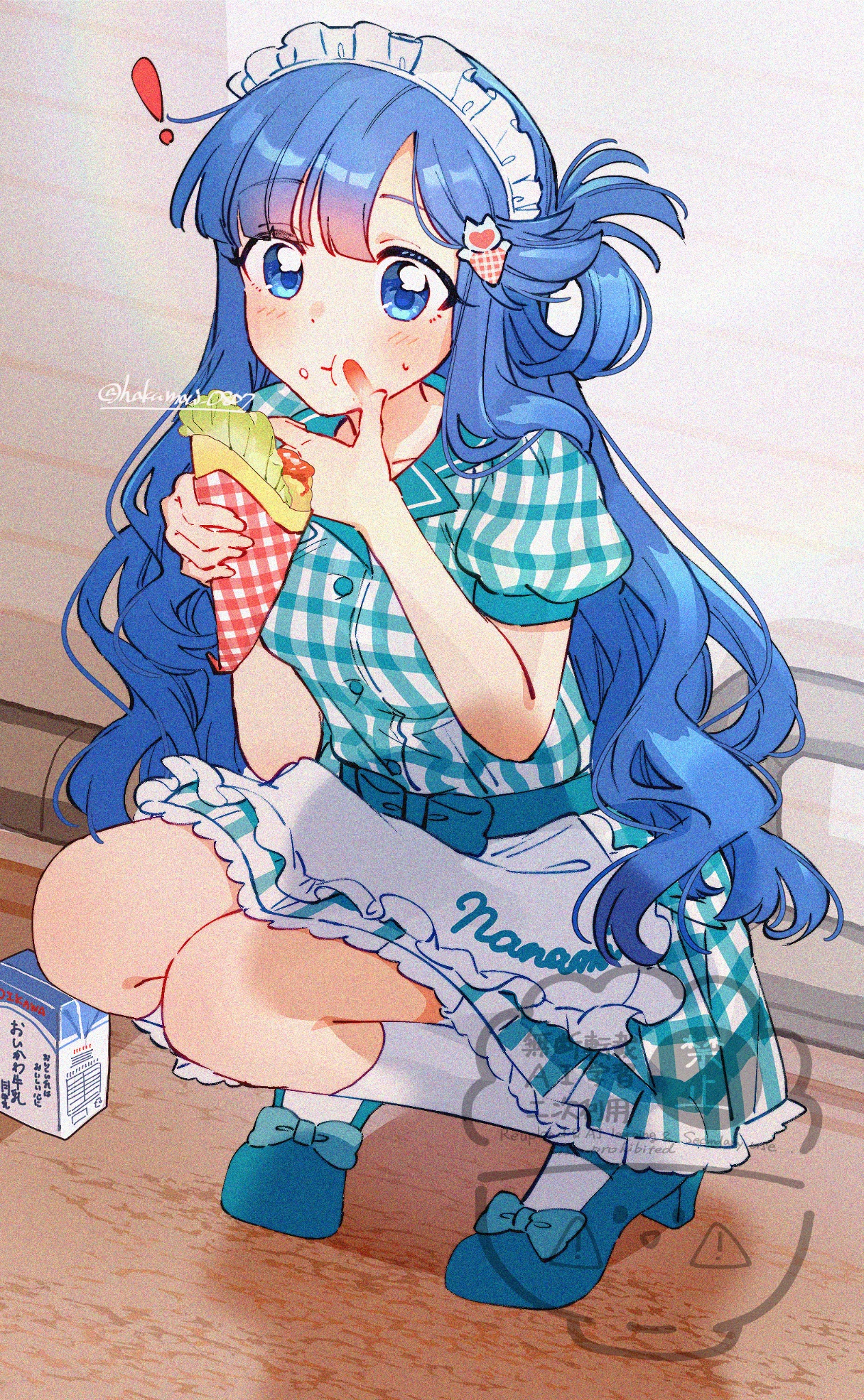 ! 1girl :t apron artist_name asari_nanami blue_eyes blue_hair blush bow breasts character_name closed_mouth commentary_request dress drink_carton eating food food_on_face food_request footwear_bow frilled_apron frills full_body gingham_clothes gingham_dress green_bow green_dress green_shoes hair_ornament hair_rings hands_up highres holding holding_food idolmaster idolmaster_cinderella_girls ketchup kneehighs long_hair looking_at_viewer milk_carton petticoat puffy_short_sleeves puffy_sleeves raised_eyebrows raru_buran shoes short_dress short_sleeves single_hair_ring small_breasts small_sweatdrop socks solo squatting twitter_username waist_apron watermark white_apron white_headdress white_socks wiping_face