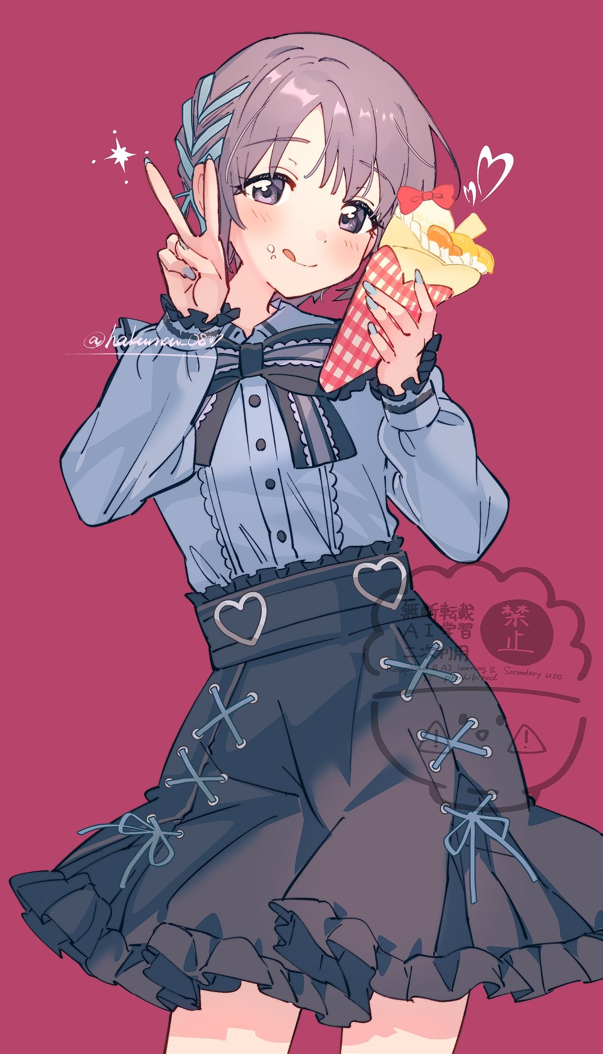 1girl :q artist_name black_bow black_skirt blue_nails blue_ribbon blue_shirt blush bow braid closed_mouth commentary contrapposto cowboy_shot crepe cross-laced_clothes cross-laced_skirt fingernails food food_on_face frilled_skirt frilled_sleeves frills grey_hair hair_ribbon hands_up head_tilt heart high-waist_skirt highres holding holding_crepe holding_food idolmaster idolmaster_cinderella_girls jirai_kei large_bow long_fingernails long_sleeves looking_at_viewer nail_polish otokura_yuuki parted_bangs purple_eyes raised_eyebrows raru_buran red_background ribbon ribbon_braid shirt shirt_tucked_in short_hair simple_background skirt smile solo sparkle standing tongue tongue_out twitter_username v watermark