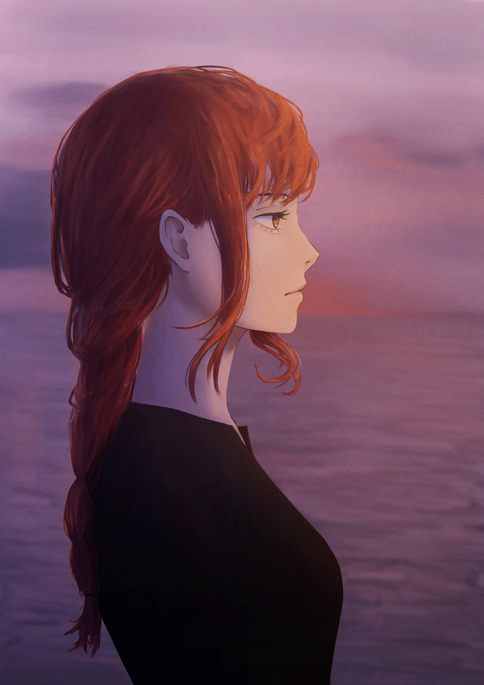 1girl aanryus absurdres black_dress braid chainsaw_man closed_mouth dress dusk from_side highres long_hair makima_(chainsaw_man) ocean profile red_eyes red_hair sidelocks solo