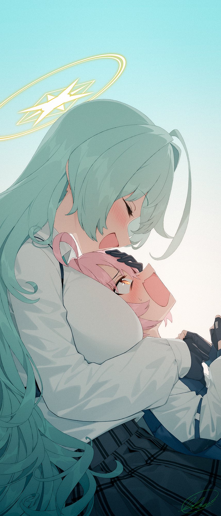 2girls :o ^_^ ahoge aqua_hair black_gloves black_skirt blew_andwhite blue_archive blush breasts closed_eyes commentary_request dress_shirt embarrassed fingerless_gloves gloves halo highres hoshino_(blue_archive) hoshino_(first_year)_(blue_archive) huge_ahoge large_breasts long_hair long_sleeves looking_at_another lying lying_on_person multiple_girls on_back pink_hair school_uniform shirt shirt_tucked_in signature skirt smile sweatdrop very_long_hair white_shirt yume_(blue_archive) yuri