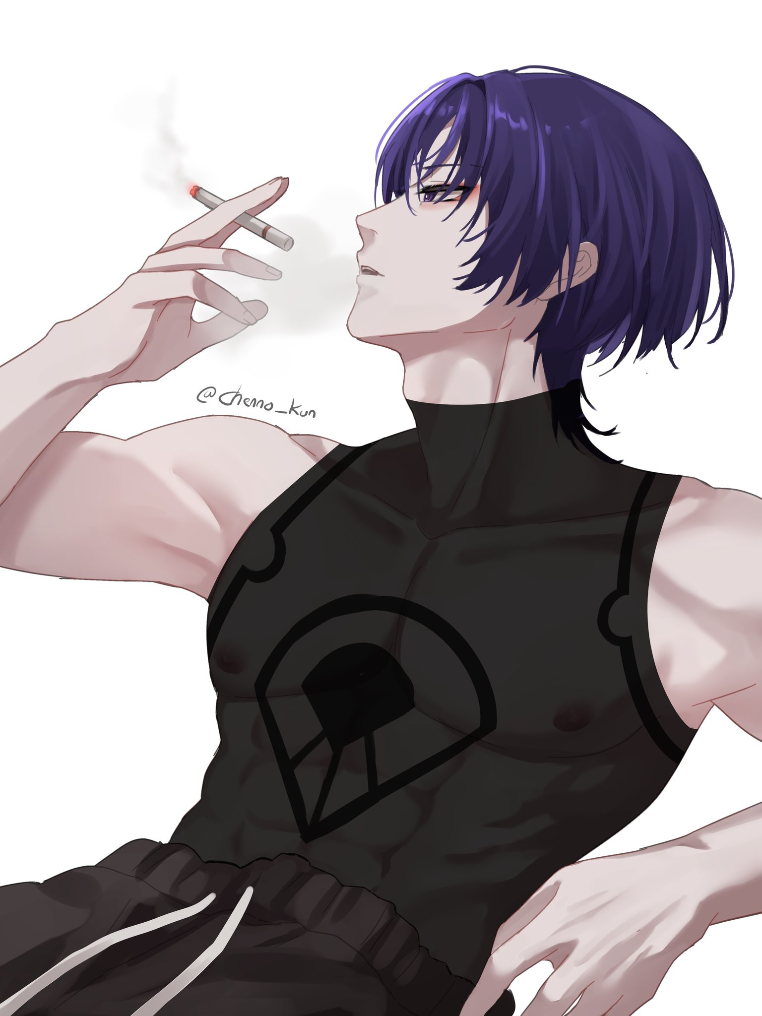1boy black_pants black_shirt blunt_ends chenno_kun cigarette genshin_impact highres holding holding_cigarette male_focus pants purple_eyes purple_hair scaramouche_(genshin_impact) shirt short_hair solo wanderer_(genshin_impact) white_background
