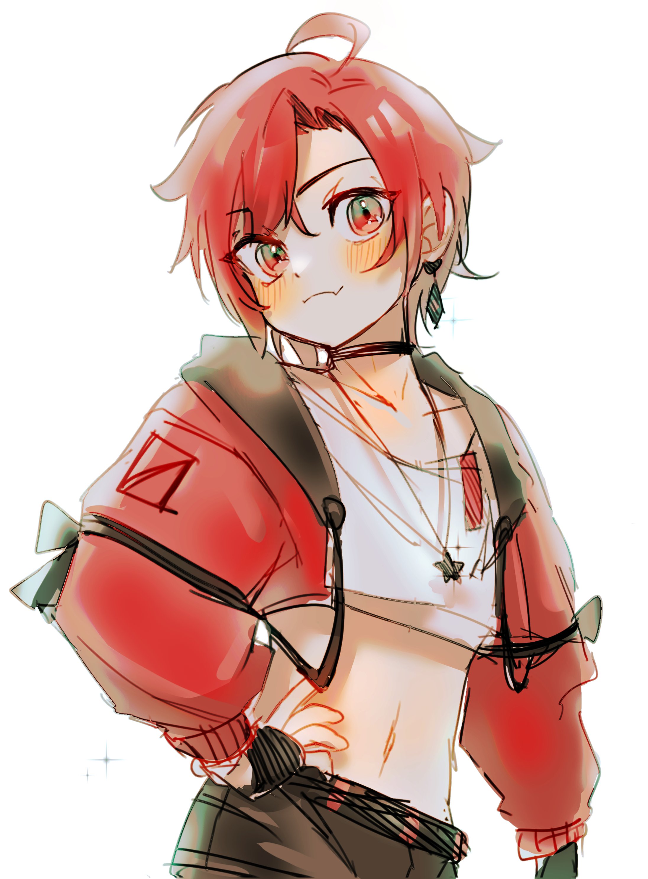 1boy absurdres ahoge amain_dudu choker commentary cropped_shirt fang hair_between_eyes hand_on_own_hip highres holostars holostars_english jacket long_sleeves looking_at_viewer machina_x_flayon male_focus navel red_hair red_jacket short_hair side_part skin_fang smile solo untranslatable_commentary upper_body virtual_youtuber white_background