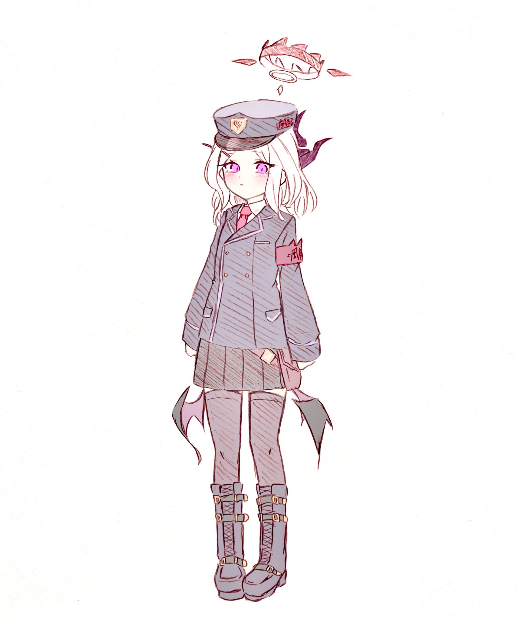 1girl aged_down black_skirt black_thighhighs blue_archive blush breasts demon_girl demon_horns demon_wings eevee_chan full_body gehenna_academy_logo hat highres hina_(blue_archive) horns looking_at_viewer medium_hair purple_eyes simple_background skirt small_breasts solo standing thighhighs white_background white_hair wings